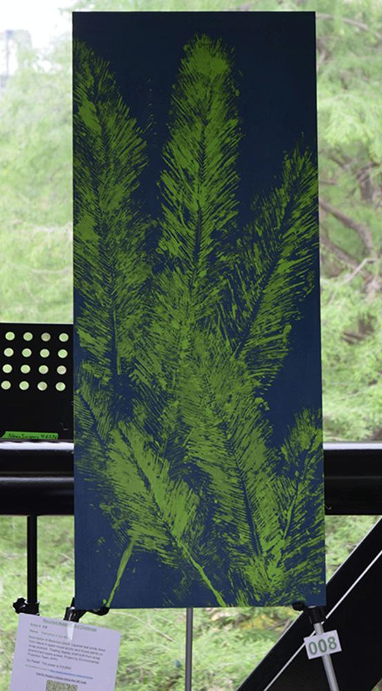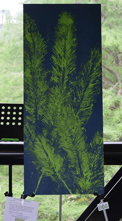 Layered leaf prints direct from nature in spare mixed acrylic and house paints on scrap plywood. Floating display shelf built from scrap plywood and spare screws. Project by Environmental Protection Team (EPP) Go Planet! The power is YOURS! Piece is Tall about 2 feet wide by 4 feet tall Cannot be shipped