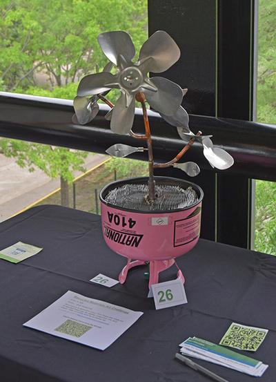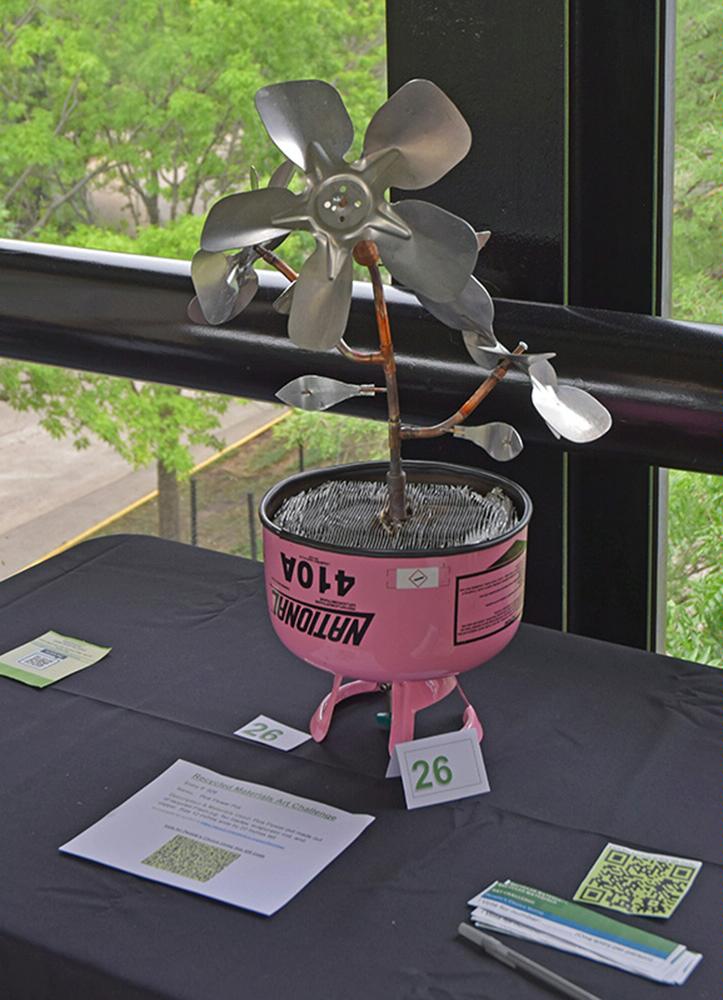 Pink Flower pot made out of a recycled Freon jug, fan blades, evaporator coil, and copper. Size 12 inches wide by 20 inches tall Cannot be shipped