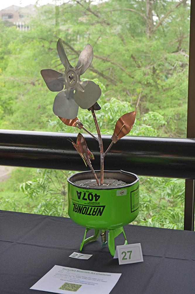 Green Flower Pot made out of recycled Freon jug, fan blade, evaporator coil, and copper. Size 12 inches wide by 20 inches Tall Cannot be shipped
