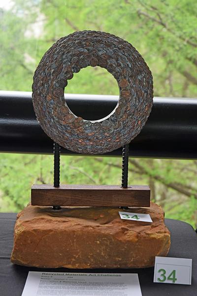 This sculpture is a ring of approximately 1,500 corroded pennies. It rises as a circle, evoking a sense of timeless and unbroken hope. Gathered from MD Anderson’s fountains, these pennies, once cast as wishes, were too worn for banks. Now, reborn as a sculpture, they form a symbol of continuity, like life, like hope, like us. Each penny once held a wish: for time, for healing, and strength. Some brought recovery; others held grief. Tilted upward, each penny now oriented towards a new plane, this ring echoes the circle of life, carrying both endings and beginnings, holding both weight and light. The pedestal was born of reclaimed rebar from a sidewalk and a wooden finish sample (a piece of thermally modified wood and plywood from a broken window repair. The base is from landscape rock from the HMB Prairie. These now anchor and support this circle in ever-present and reverent stillness. Made entirely from leftover elements, this piece is a quiet testament: that from discarded things, from wishes realized and unrealized, beauty arises, a perfectly imperfect circle without beginning or end. Very heavy, cannot be shipped.