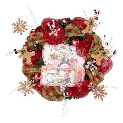 Greenery wreath wrapped with green & red deco mesh and solid red mesh and adorned with a red bow and a cute metal sign "Christmas Calories Don't Count". This wreath is also decorated with gingerbread cookie snowflakes, gingerbread men, and peppermint candy picks and ornaments. Created by Rebecca Deen.