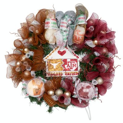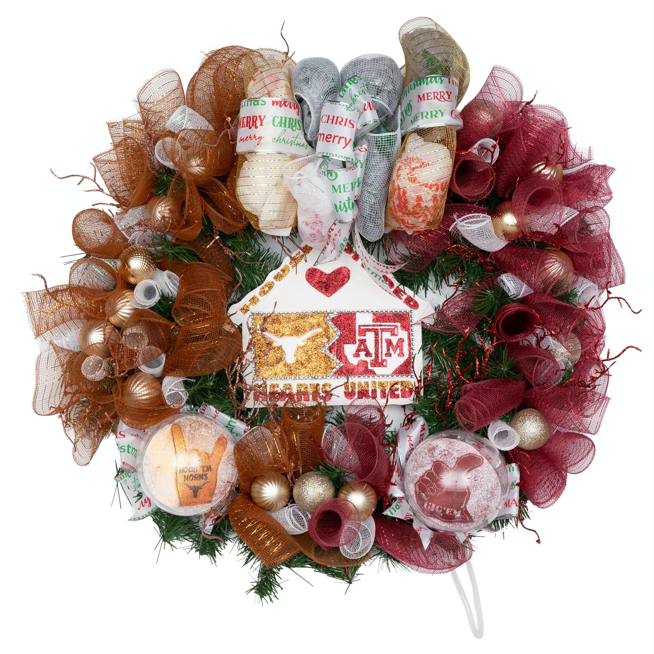 Celebrate the season with this House Divided Christmas Wreath. It has a split design with UT's iconic burnt orange on one side and Texas A&M's classic maroon on the other. Team hand sign proudly displayed to represent both schools. This wreath is adorned with curled mesh ribbons, gold ball ornaments, glittery picks with a centerpiece that unites it all. Created by Ann Jimenez.