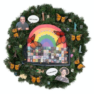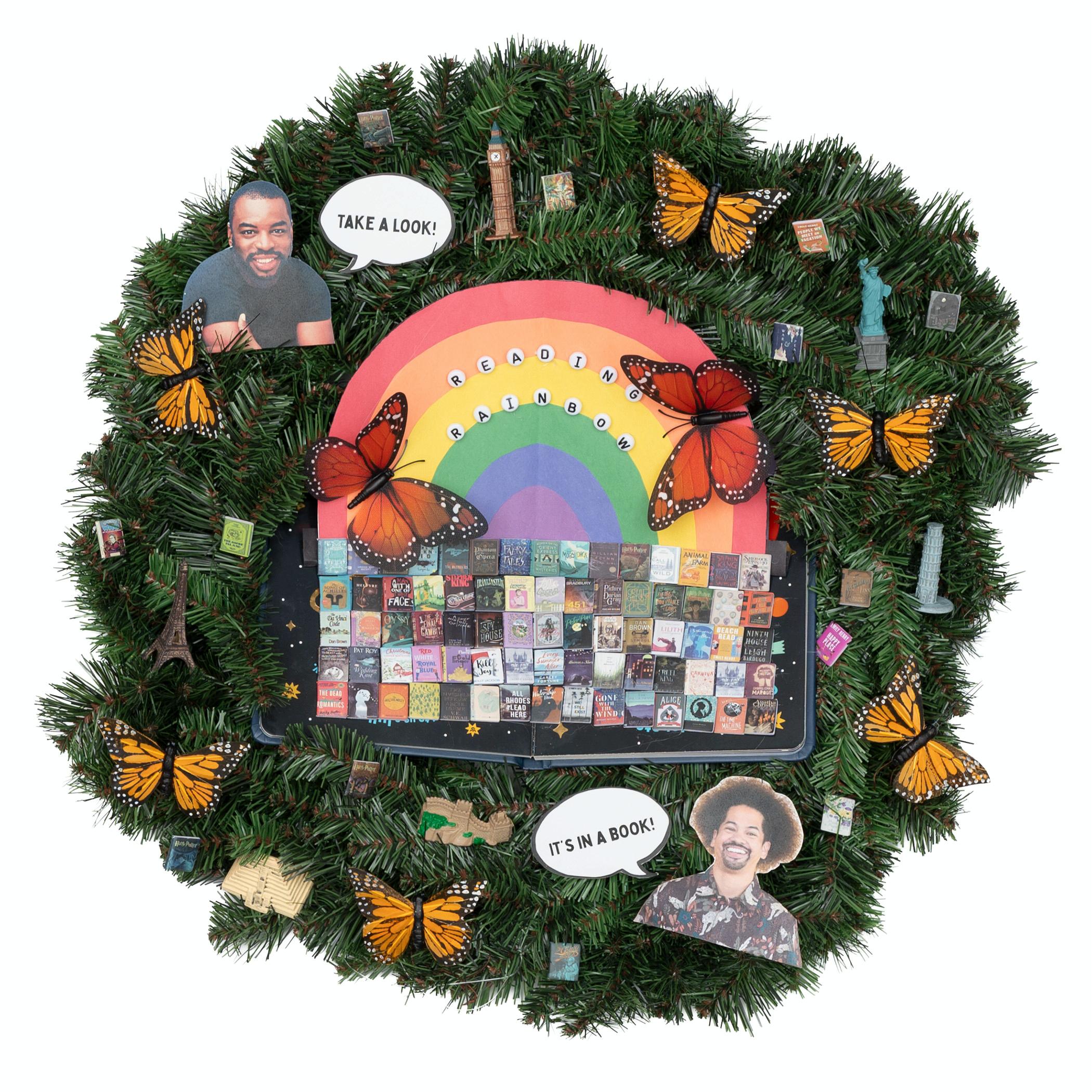 A colorful wreath inspired by the joy of reading! A homage to 90's kids everywhere who grew up listening to LeVar Burton. Perfect for your home or a cozy reading nook, this wreath reminds everyone that you can go anywhere, take a look, it's in a book! Created by Helen Wu.