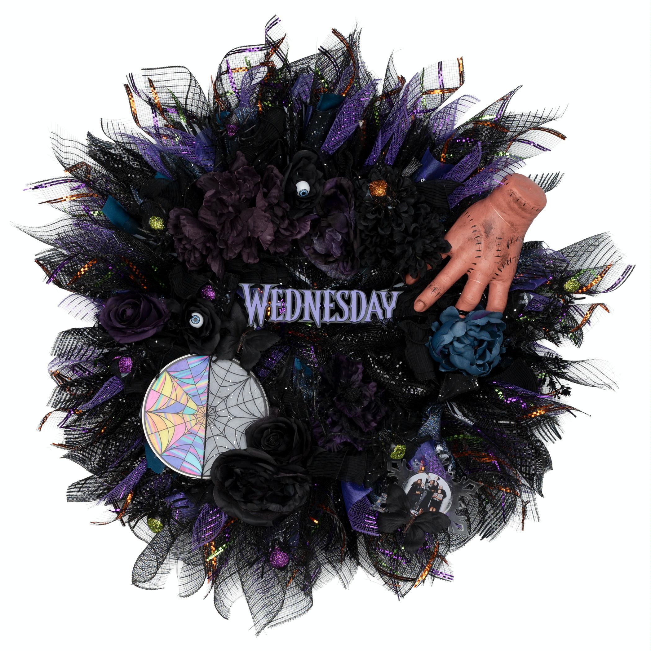 This is for all fans of Wednesday Addams! This wreath is adorned with spooky and fun decor that would be approved by Wednesday herself. In a world full of Kardashians, Be A Wednesday! Created by Alexandra Stark.