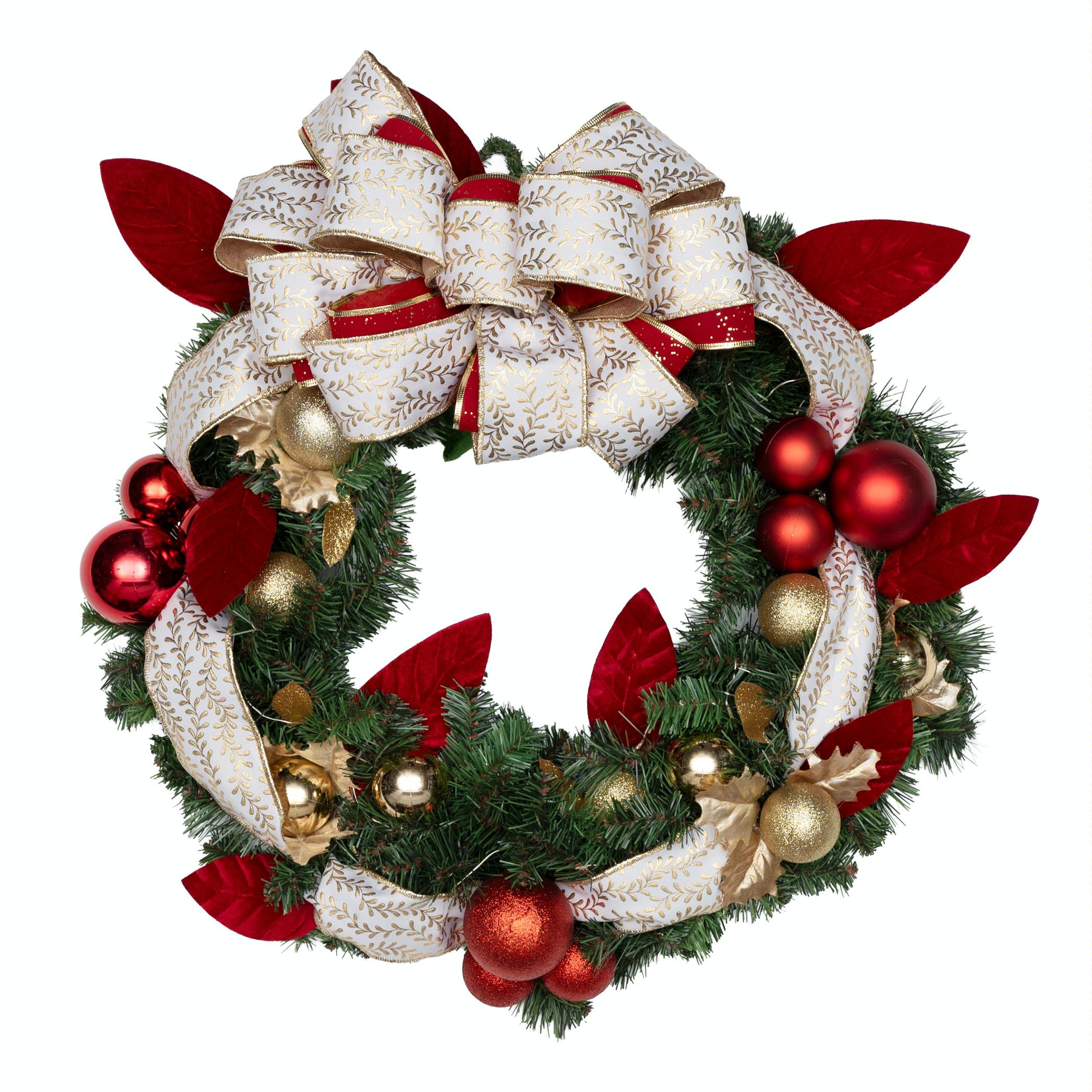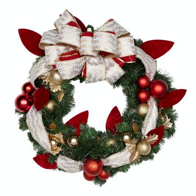 Festive red and gold wreath with ornaments, foliage, and remote-controlled lights, is perfect for brightening your door this Christmas. Created by Pamela Scurry.