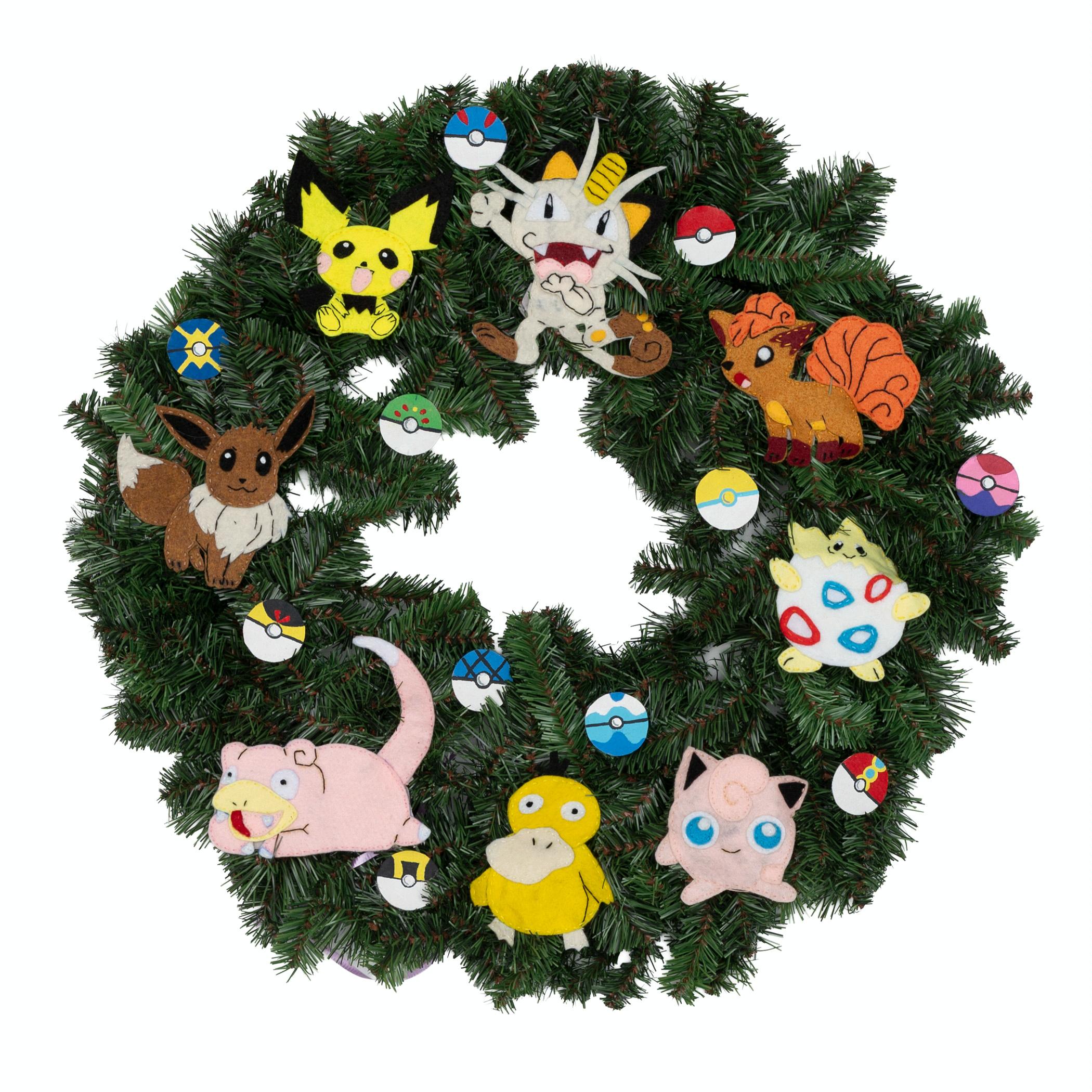 Handmade Pokémon felties that are hand-stitched adorn this wreath. A perfect addition for any Pokémon fan for the holidays. Created by Lenore Wilbert of Veterinary Medicine and Surgery.