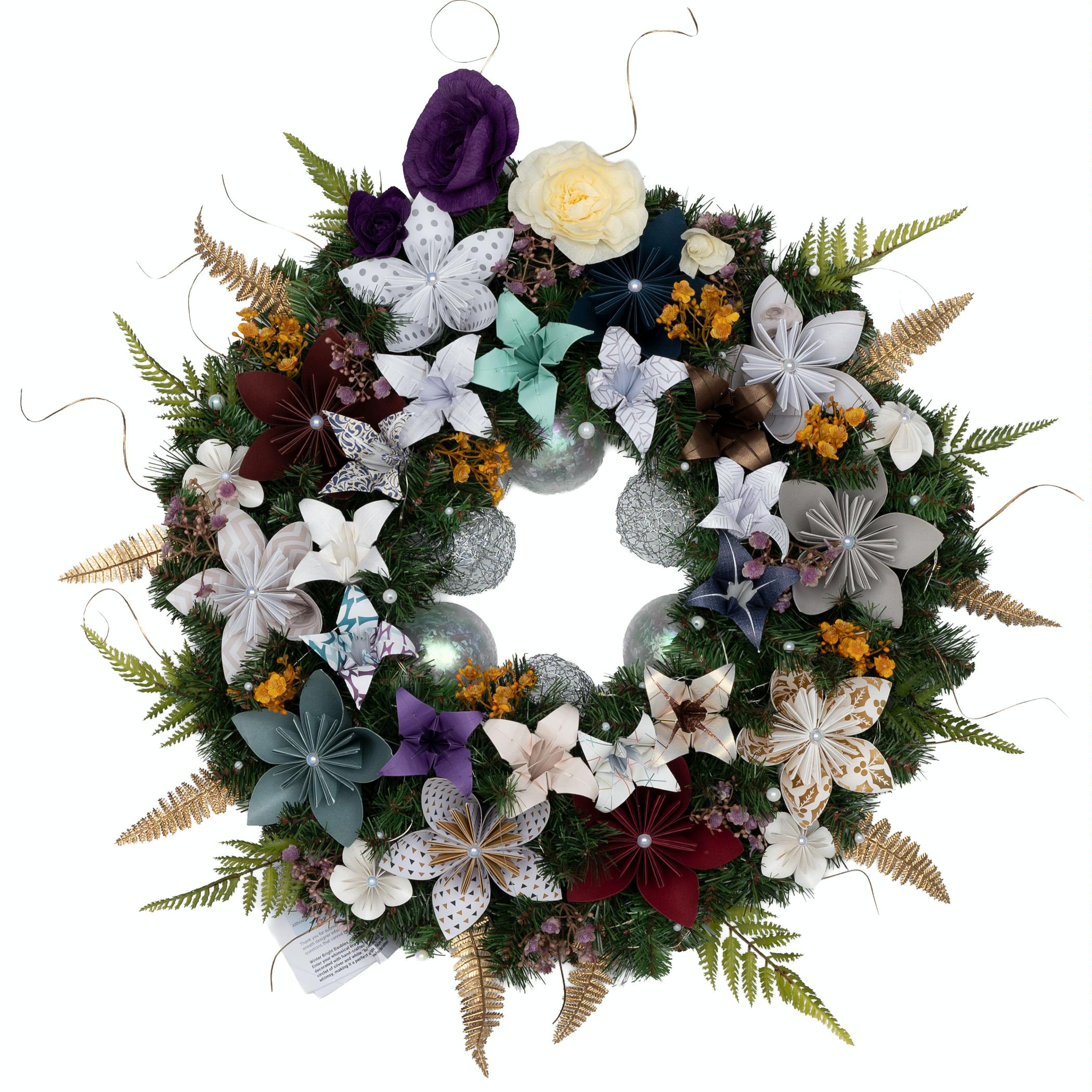 Enter your whimsical era this season with a handmade, pre-lit wreath curated with holiday colors in mind! This wreath is beautifully decorated with hand-crafted paper origami roses and flowers studded with pearls, silk flowers, and greenery, and crowned with a circlet of silver and white baubles that twinkle against the light. The pre-lit twinkle lights woven into the wreath only adds to the whimsy, making it a perfect addition to the magic of your home for the holidays! Created by Danika Dirba, Jennifer Ng, and Carmen Pollock.