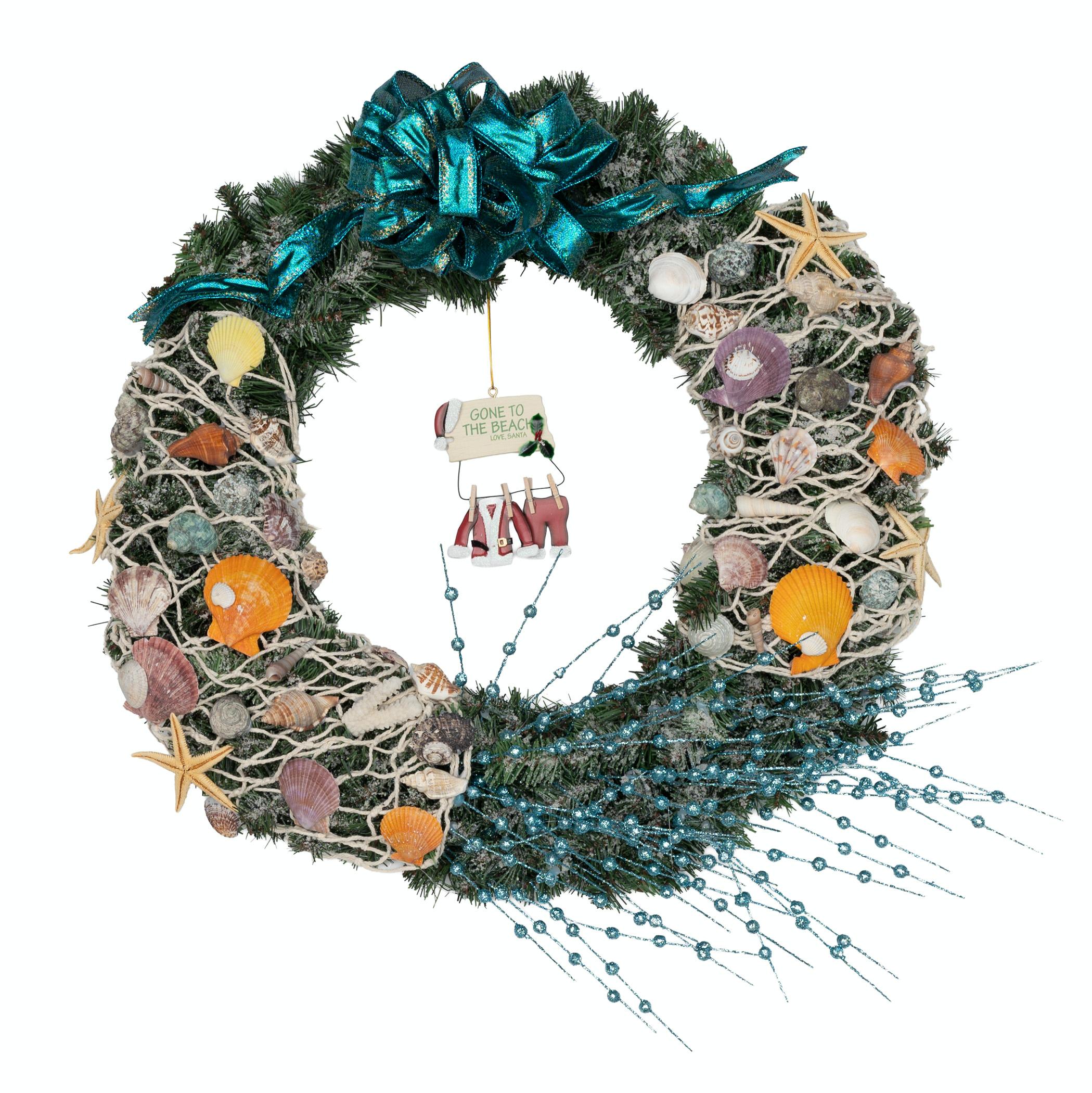 "Dreaming of sunshine and sea breezes this holiday season? Even Santa needs a break from the North Pole once in a while! Santa’s Getaway captures the magic of his favorite beach hideout — where warm sand replaces snow, and seashells shimmer in place of icicles. This handcrafted wreath is wrapped in genuine fishing net and adorned with colorful seashells, delicate round beads that mimic the sparkle of ocean water, and a striking turquoise bow. At its heart, a festive ornament brings Santa’s beachside retreat to life. Whether you live by the coast or just wish you did, this unique wreath will bring a splash of seaside fun, warmth, cheer, and a touch of tropical Holiday spirit to your home all season long. Created by Ursula Toliver
