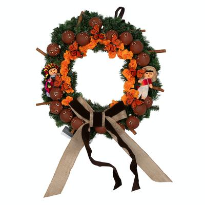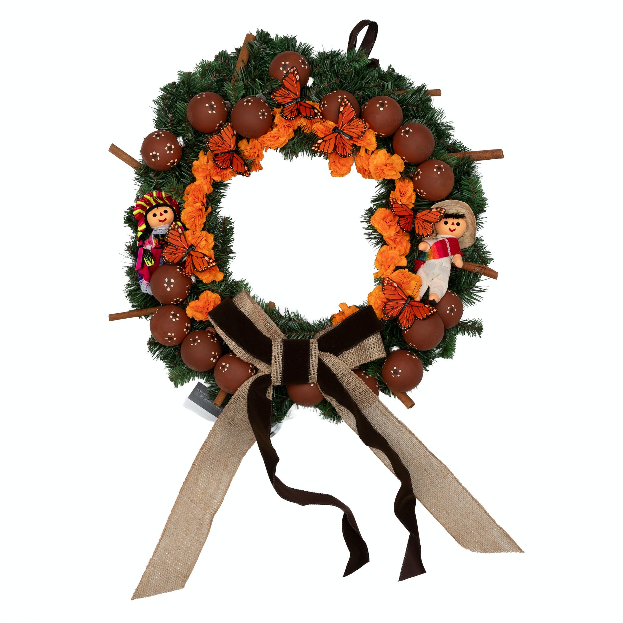A vibrant Mexican-style Christmas wreath filled with monarchs, marigolds, cinnamon sticks, and muequitos for a warm holiday touch right at the entrance of your casita. Created by Dianne Pagua