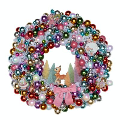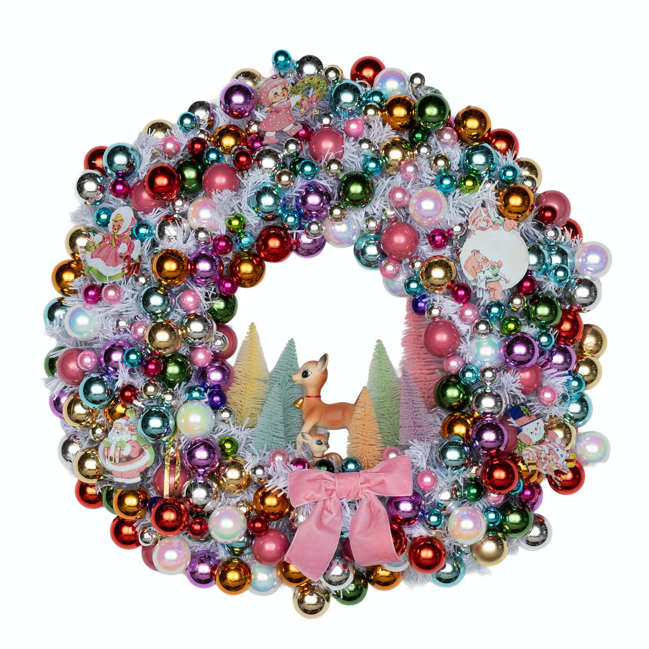 A festive wreath inspired by the charm of mid-century holiday traditions and the joyful memories of Mom's childhood. It features an eclectic mix of glossy ornaments in hues of red, gold, green, teal, pink, purple, and silver arranged in a full, balanced composition. The white wreath adds a snowy shimmer, enhancing the wreath's bright and playful aesthetic. At the center, a charming vignette of pastel bottle brush trees in soft pink, yellow, green, and white surrounds two delicate deer figurines, creating a whimsical winter scene. Vintage-style cutouts of Santa Claus and cheerful children add a nostalgic touch, evoking the warmth of classic holiday illustrations. A sweet pink velvet bow at the base provides a cheerful accent that ties the entire design together. Created by Misty Kolodziejcyk