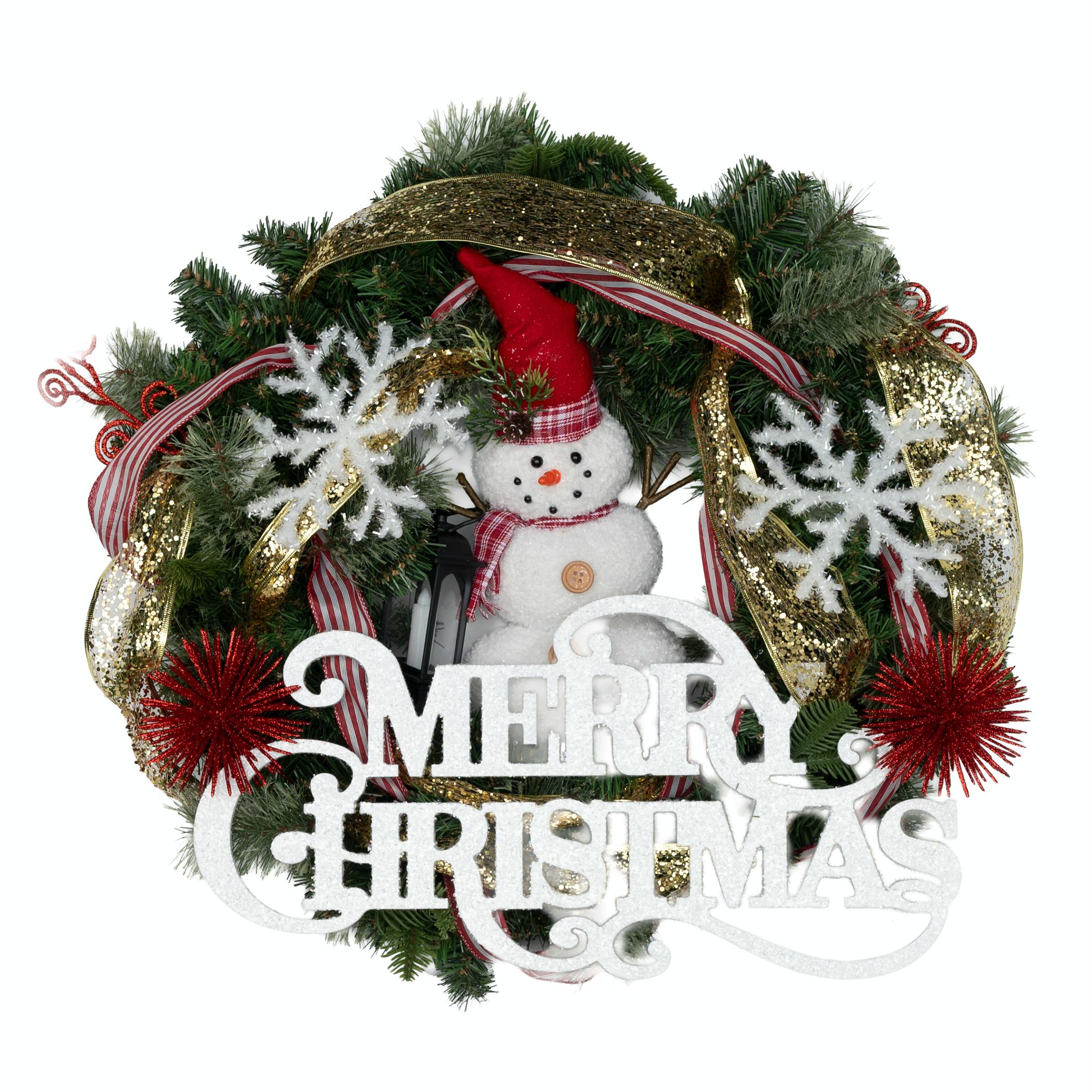 Welcome the holiday season with this charming wreath featuring a cheerful snowman holding a battery-operated LED lantern. Completing the look, a sparkly "Merry Christmas" sign adds the perfect festive touch, making this wreath a joyful addition to your holiday decor. Created by Kelly and Nick Williams