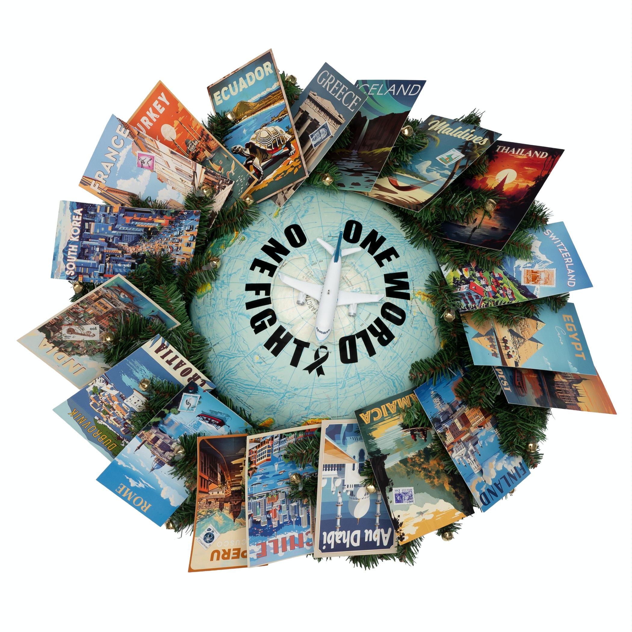 This wreath symbolizes unity, hope, and togetherness across the globe. Decorated with postcards from countries around the world, it celebrates our shared strength and the spirit of coming together beyond borders. At its heart sits a globe, representing our beautiful planet, and a small airplane circling it a reminder that no matter where we are, we are all connected. The theme, "One World, One Fight", reflects the collective resilience and compassion that unite us through challenges and triumphs alike. This wreath stands as a tribute to global harmony and the power of standing together one world, one family, one fight. Created by Bianca Ogboghodo, Vanna Bryanna, Melancon Perez, Jose Hernandez, & Steven Cuevas