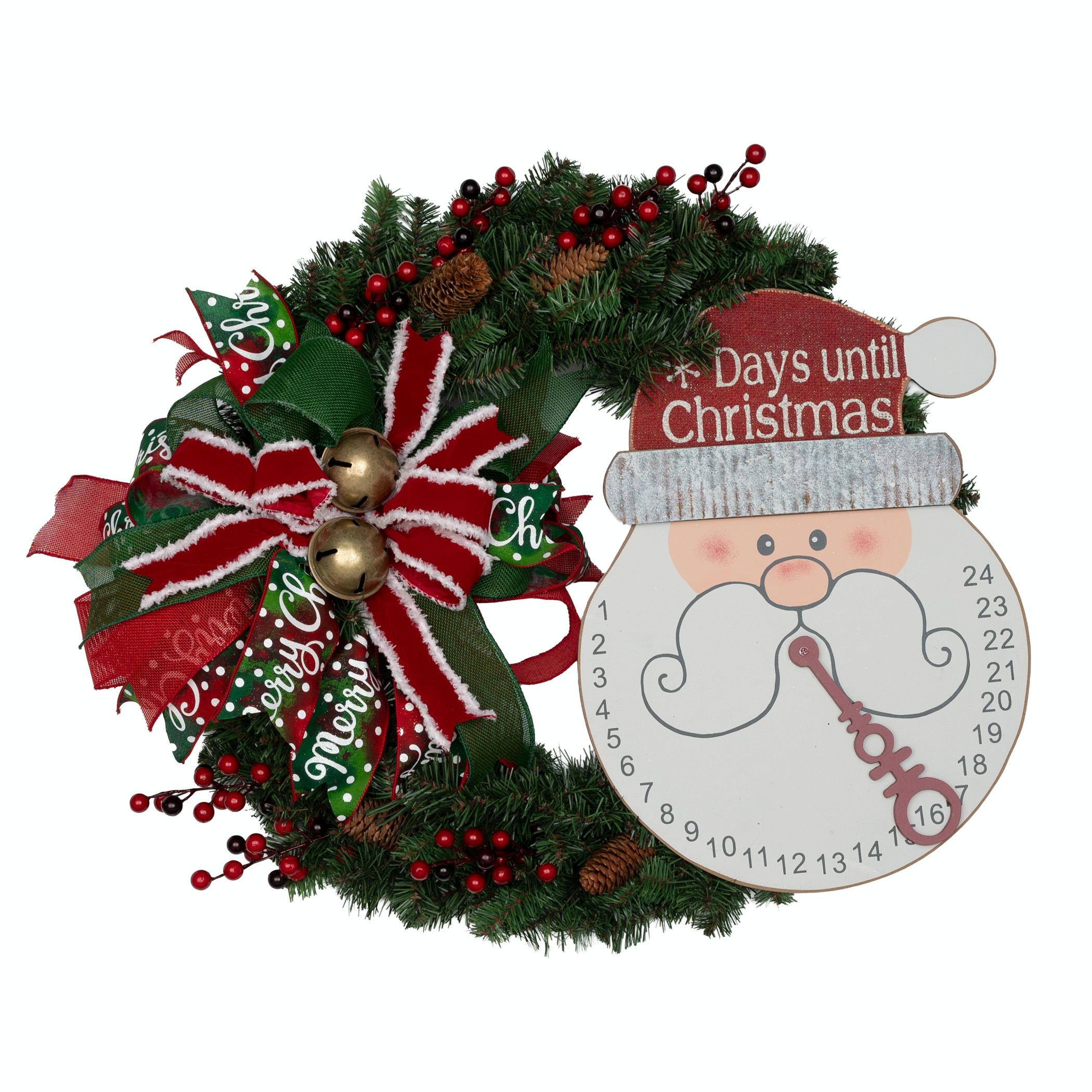 Classic evergreen wreath with Red and Green bows. Swag includes a countdown to Christmas Santa clock. Created by Jeanette Grant, Jessica Nunez, Maria Gacitua, & Jenny Giscombe