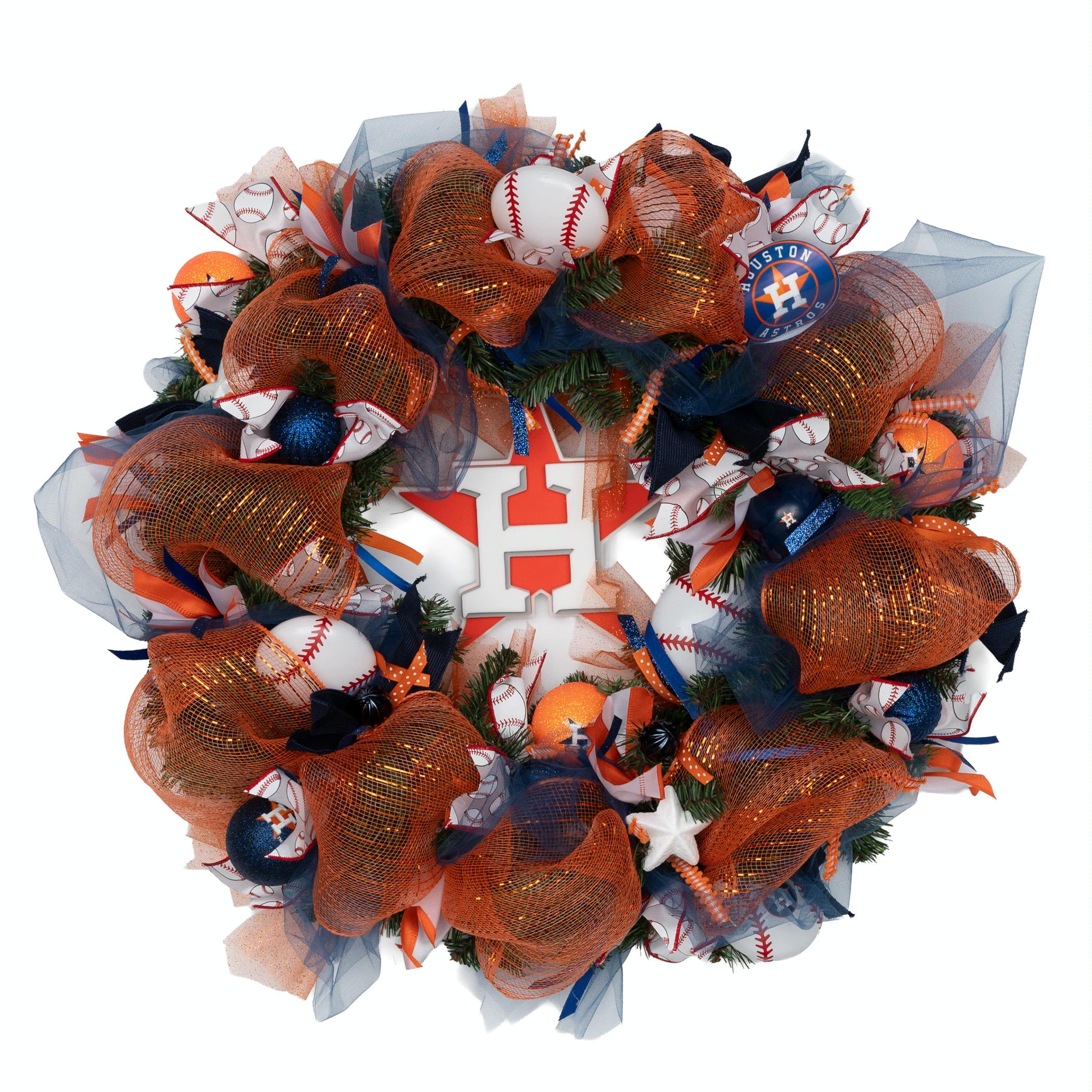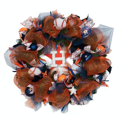 This wreath is Astros inspired, using orange, blue and white to capture team colors and the spirt of game day! Created by Paige Schorlemmer