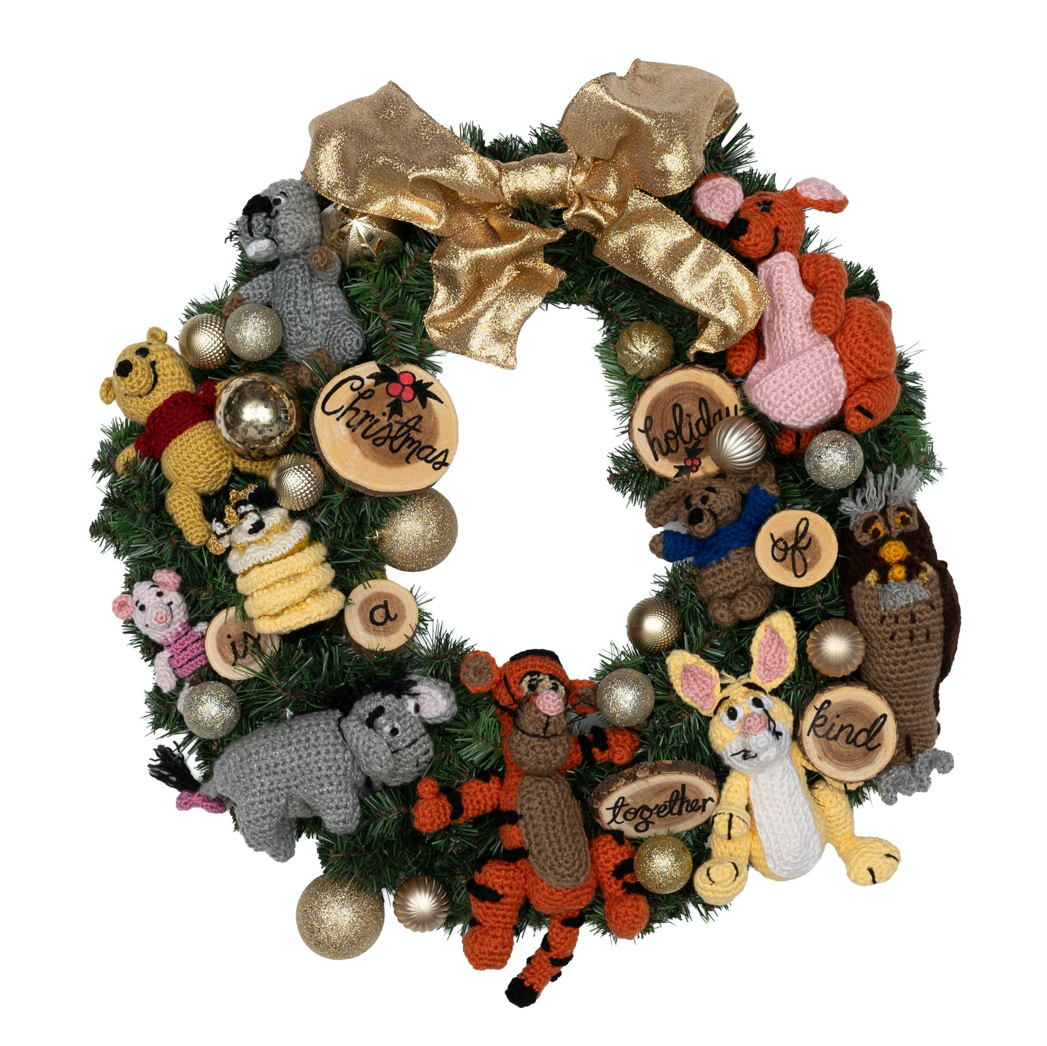 Handcrafted with love, this festive wreath brings together the warmth of Christmas and the timeless charm of Winnie the Pooh and friends. Featuring cozy crochet characters nestled among holiday greenery, it's a heartwarming touch for any home. May it bring joy, laughter, and a little Hundred Acre Wood magic to your season! This wreath comes with a Jar of Honey! Created by Inna D'Empaire & Lauren D'Empaire