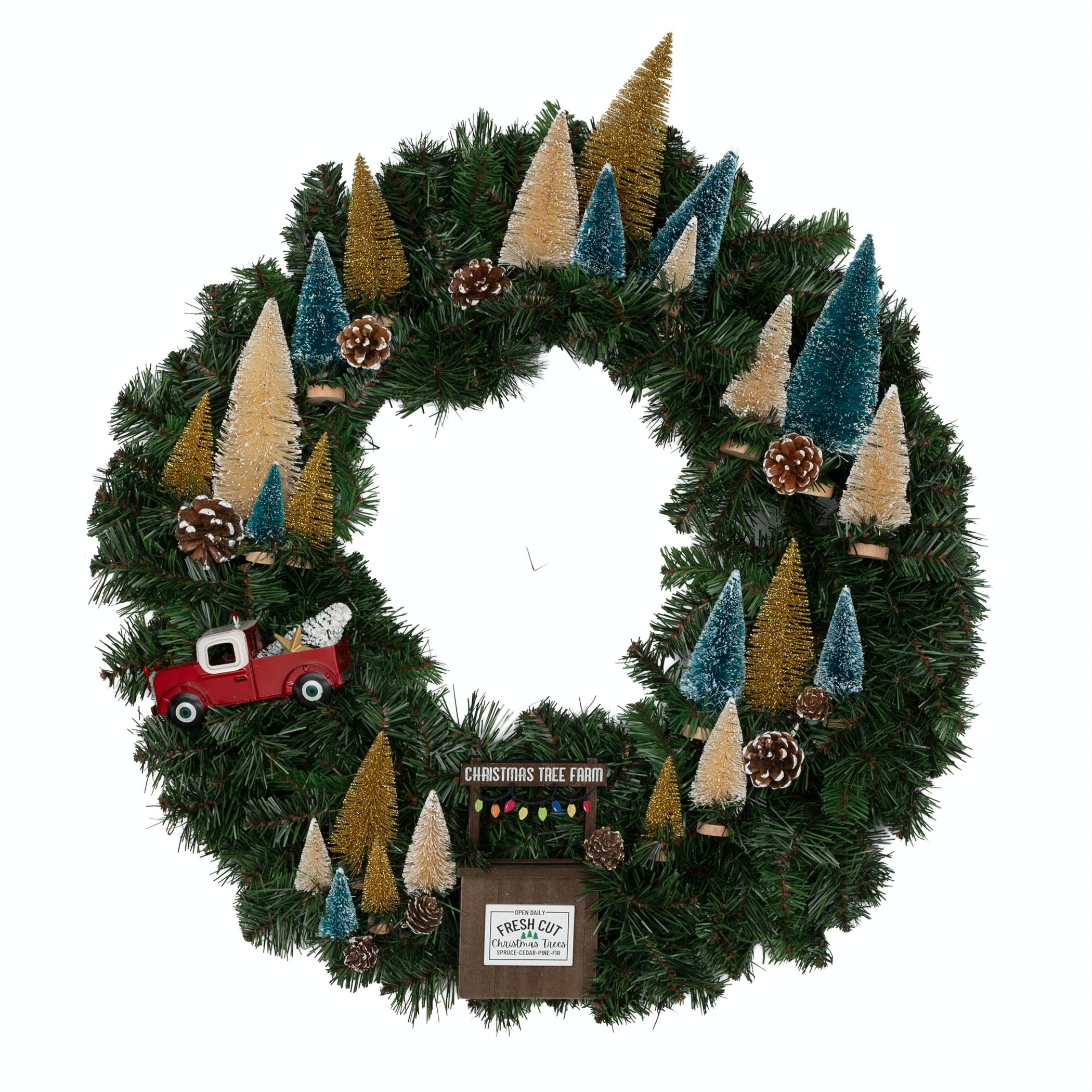 This is a wreath depicting a festive Christmas tree farm before the holiday season. Created by Sahar Khan.