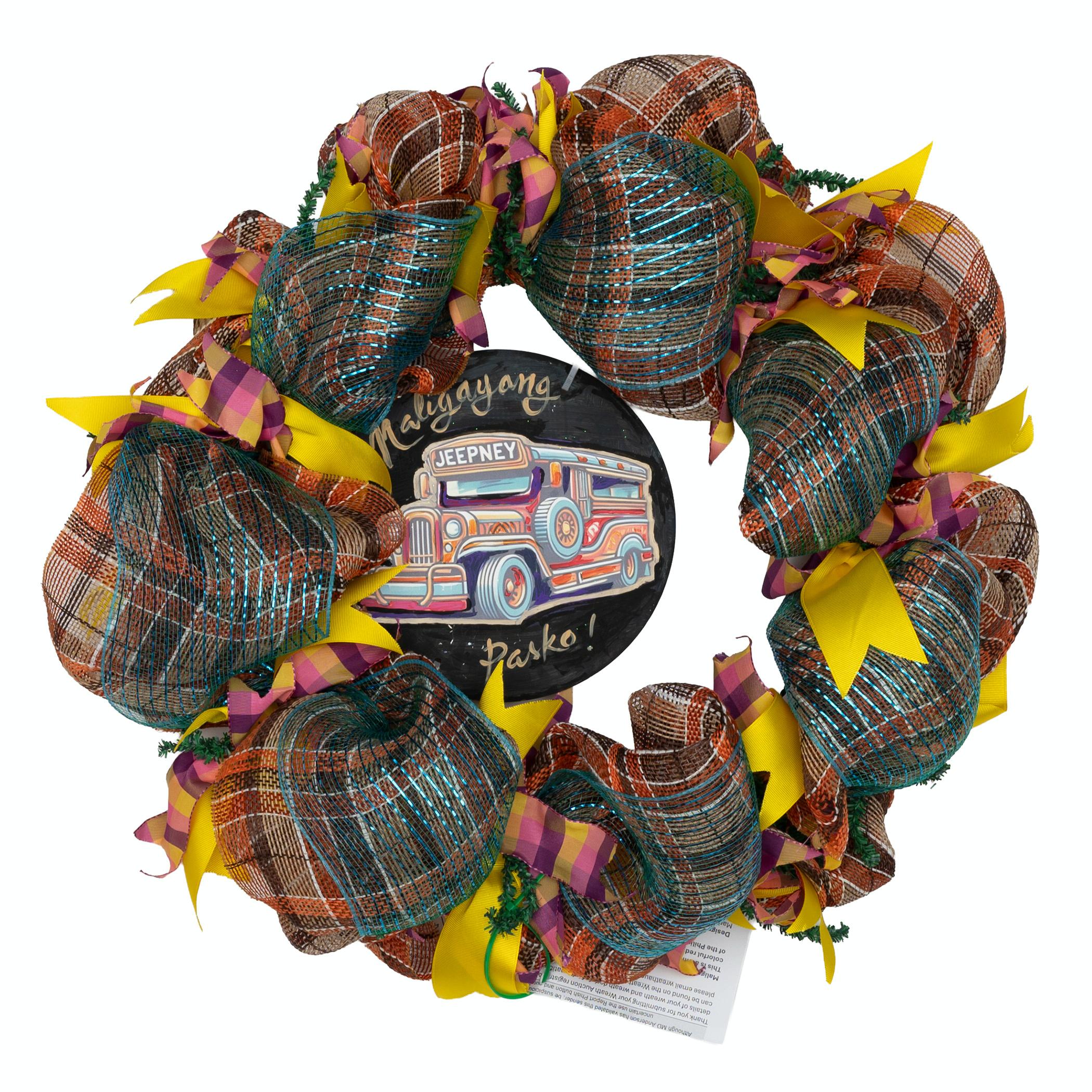This is a Christmas(Pasko) wreath co-designed with Sheilah B. The wreath has a Filipino touch- colorful red, yellow and blue Abaca fabric trim and adorned with a traditional jeepney(cultural icon of the Philippines and the country's most popular mode of transportation). Created by Maria Gabrido and Sheilah Bofil
