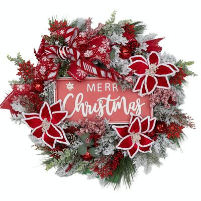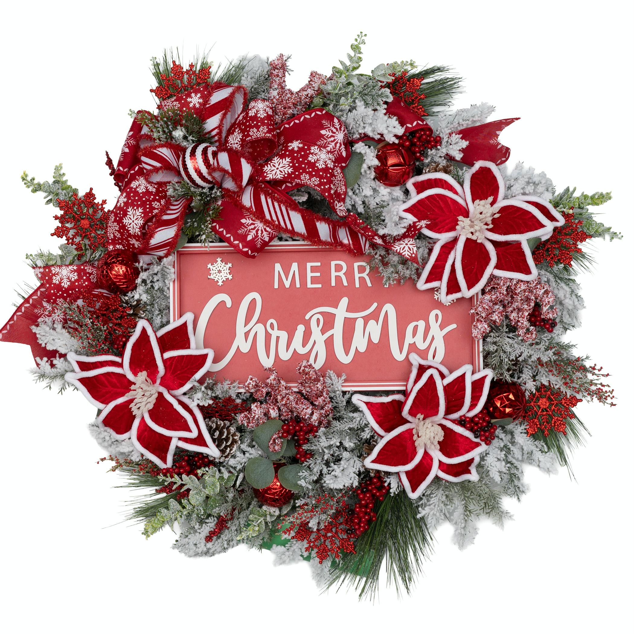 A cheerful Merry Christmas red and white wreath embellished with red poinsettias. Designed by Patty Johnston with Cancer Network.