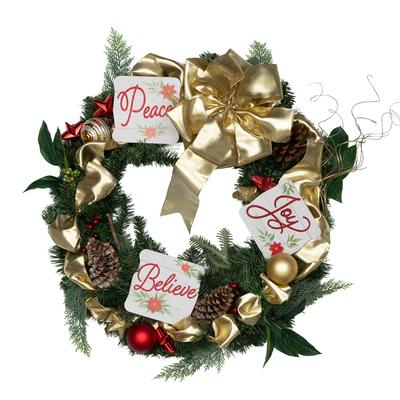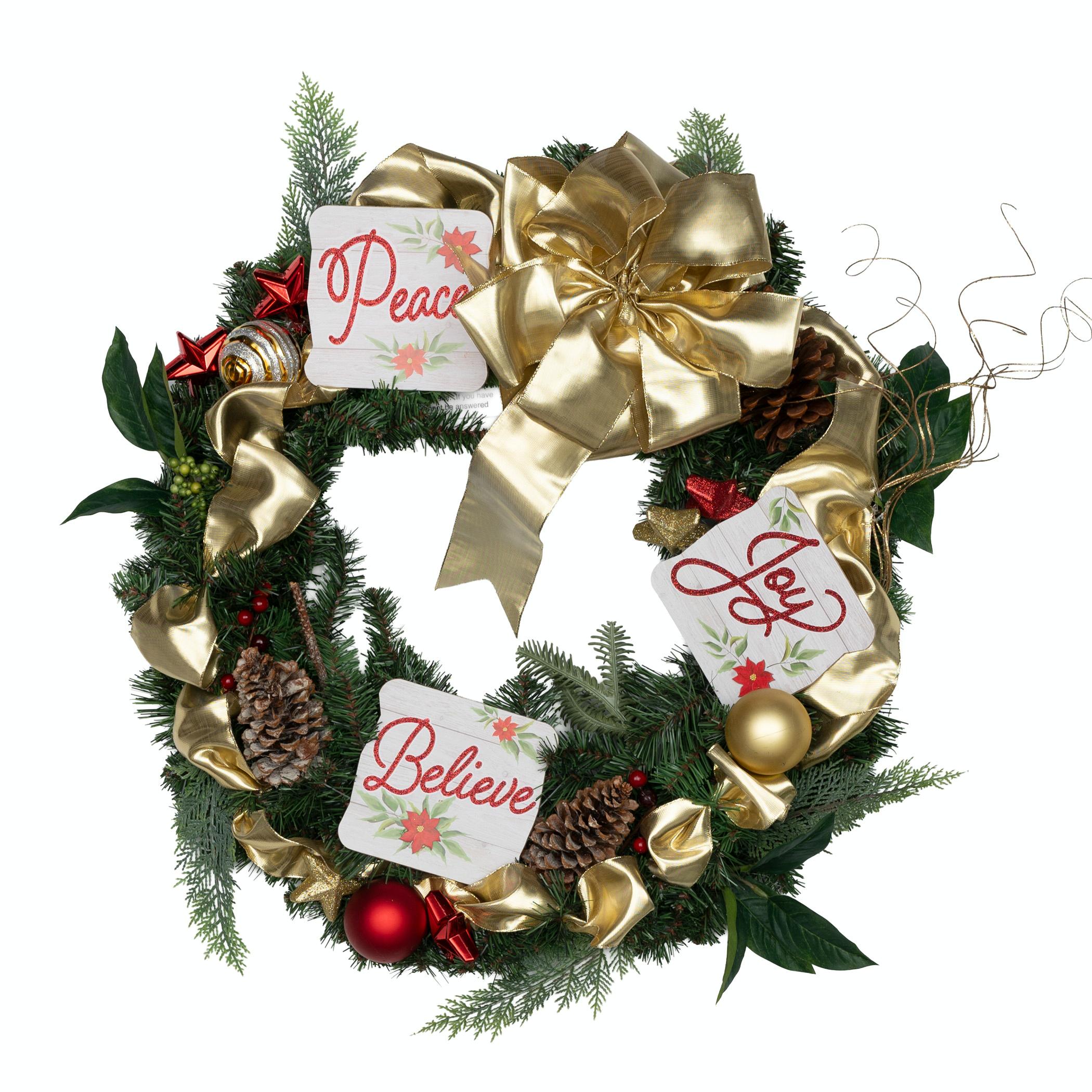 A festive wreath featuring three signs: Peace, Joy, and Believe. Decorated with gold and red ribbons, matching ornaments, assorted greenery, and natural pine cones for a warm, classic holiday look.