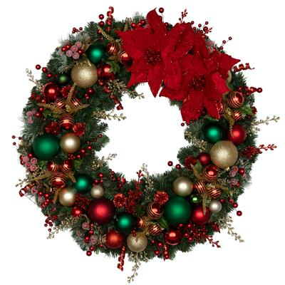 A wreath that said "go big" for the holidays and meant it with luxe poinsettias, bright ornaments, and full festive cheer from every angle. Created by: Institutional Compliance - Jasmin Aldayem and Iris Ramirez