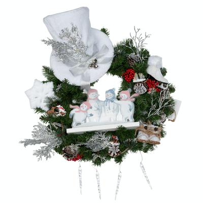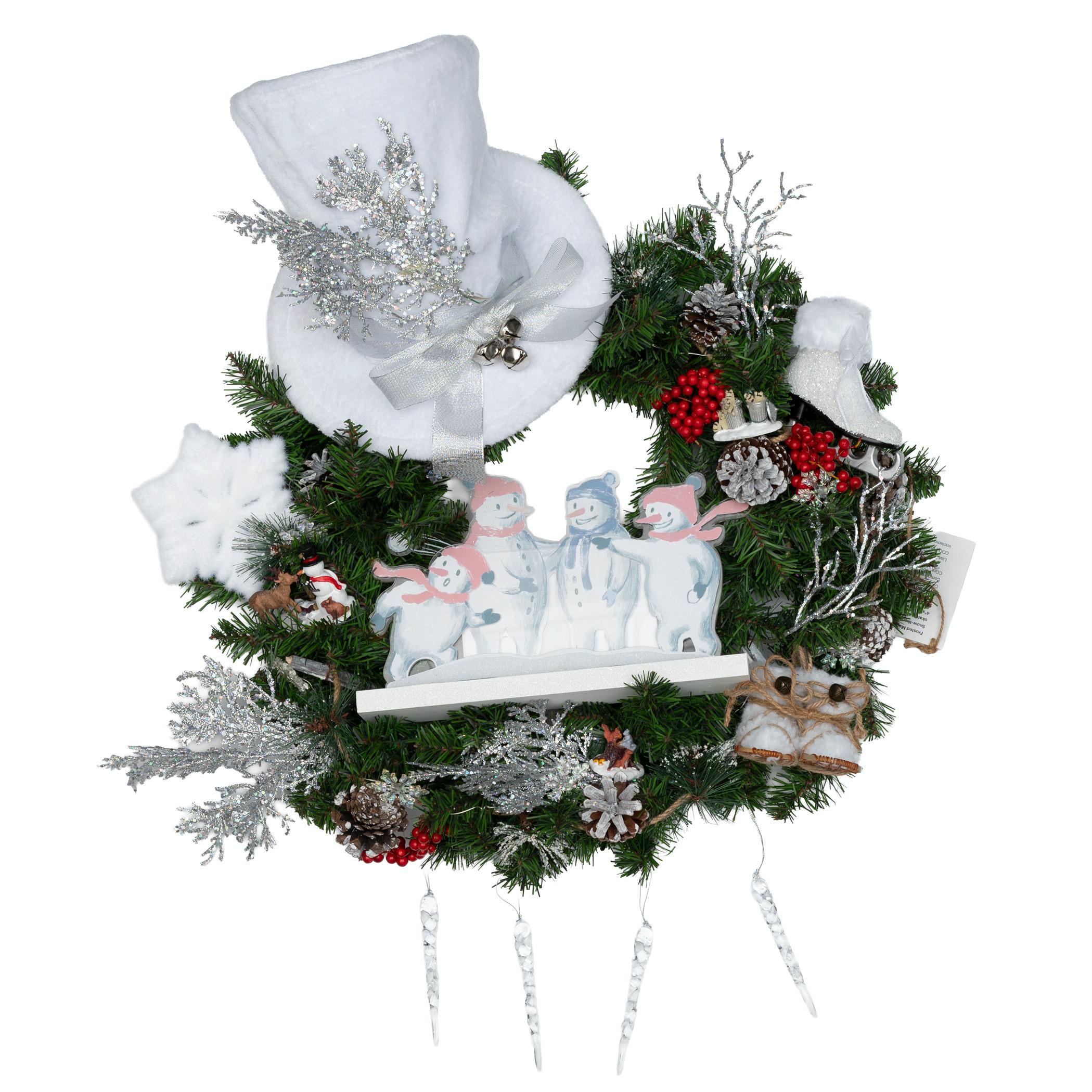 Snow-themed wreath adorned with an oversized white top hat and ornaments of snowflakes, ice skates, snowshoes, and more for your winter holiday. Includes battery powered snowflake lights and a 4"x6" snowman frame centered to hold your personal snowy photograph of your family, pets, or scene. Created by: Comparative Medicine - Carolyn Grantham and Lisa McLemore
