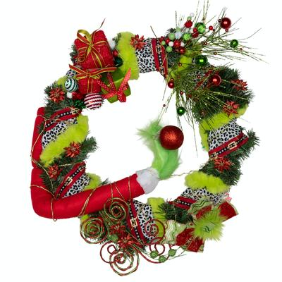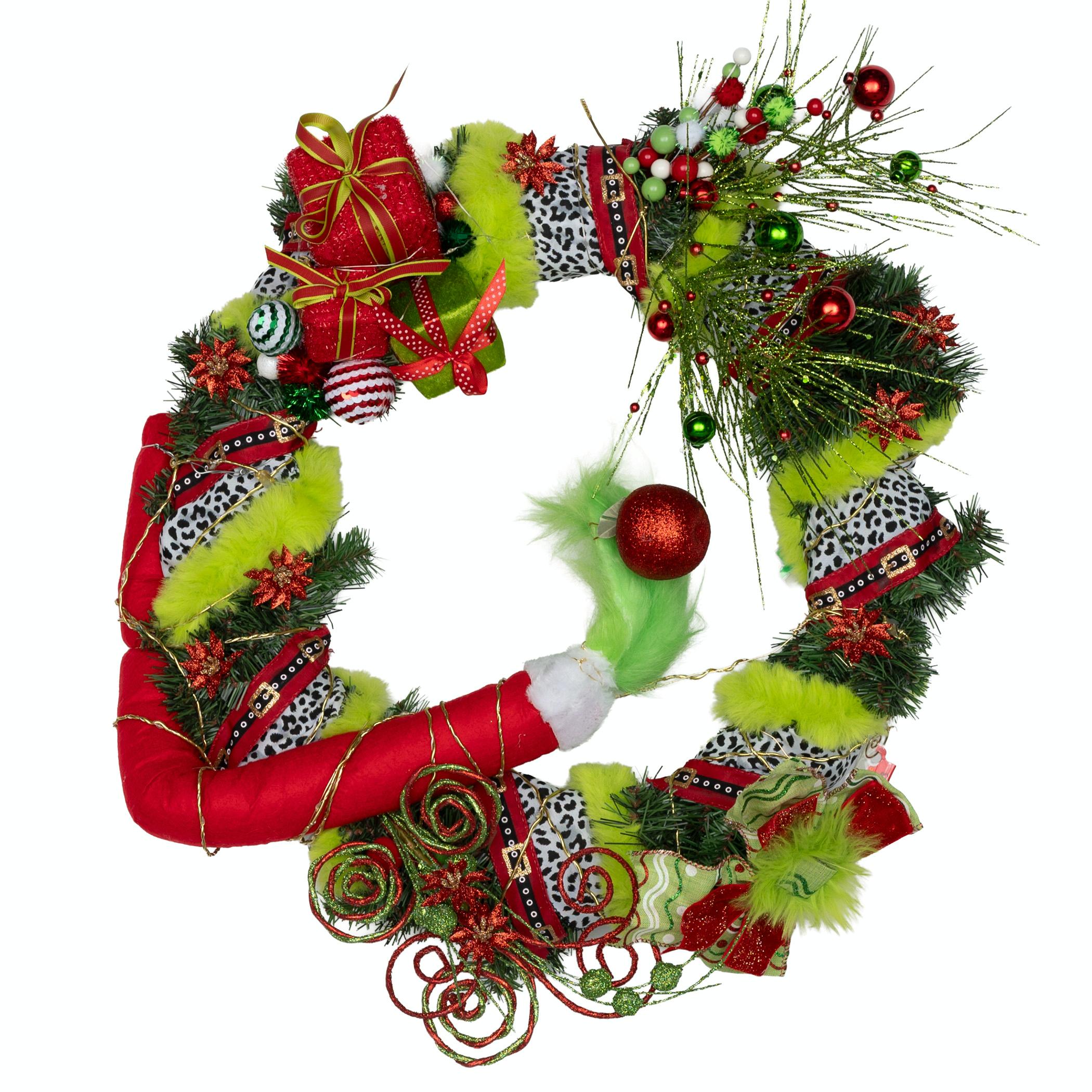 This Grinch themed wreath was decorated after the Who-Ville Christmas Heist. It sparkles with mischief and a twist of holiday spite. After the Grinch returned all the presents back under their trees, he decorated this wreath with ribbons and cheer to make every Who pleased. He sprinkled it with gifts, fairy lights, and sass anew to make your heart grow three sizes too! Created by: Ashlynn Collman G15.