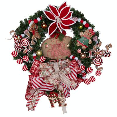 A warm, traditional wreath with gingerbread men, a cheerful train to M.D. Anderson's beginning, mint candies, and a Merry Christmas sign in classic holiday hues. Created by Eduardo Rodriguez