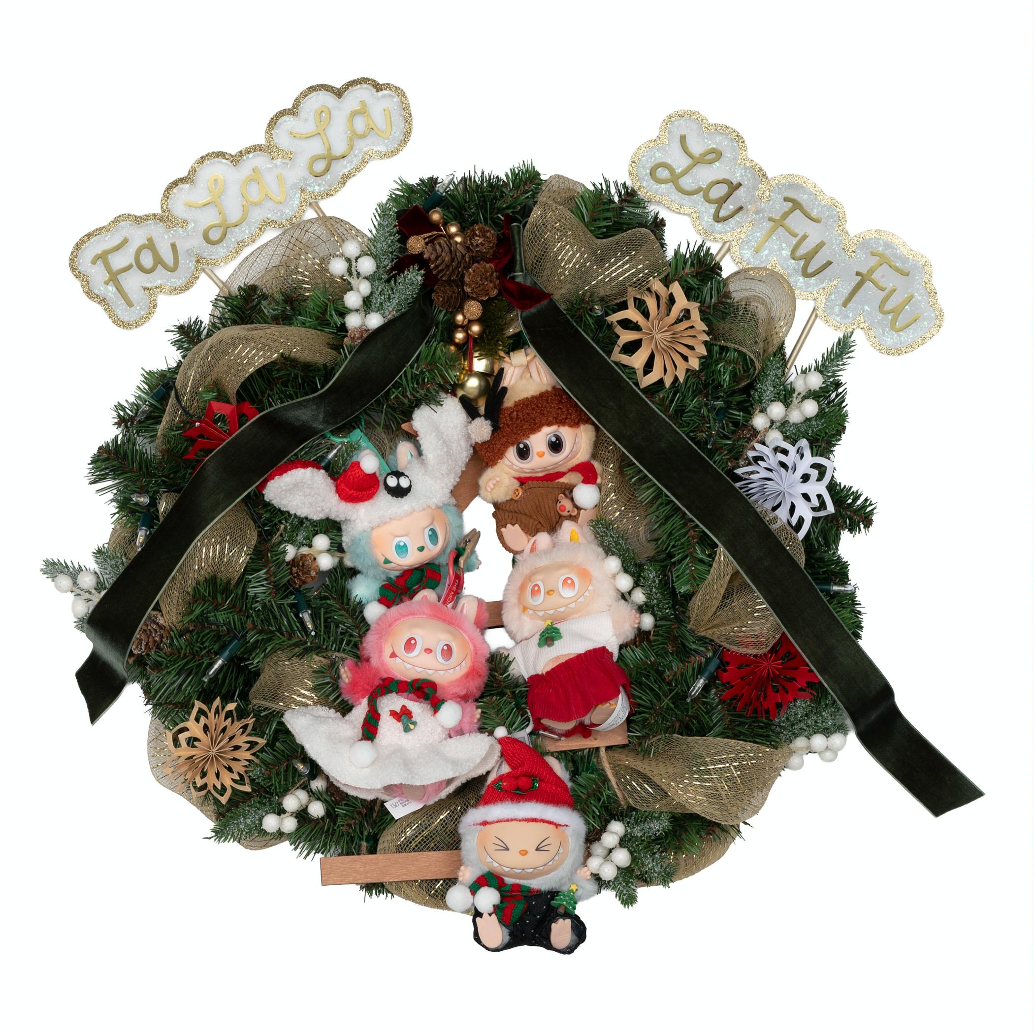 This wreath features 5 adorable Lafufus, all dressed in their winter gear and ready to spread holiday cheer! Each Lafufu wears a toothy grin, and you will too if this wreath you win! Designed by Emily Wang & Anna Jan with Pharmacy Clinical Programs. Includes an unboxed Big Energy Series Labubu - "Luck" in purple.
