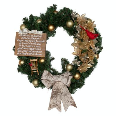 This Christmas in Heaven wreath is a touching tribute to loved ones who are no longer with us but whose presence is still deeply felt during the holiday season. It includes a miniature rocking chair which symbolizes the seat saved for loved ones we miss, while a bright red cardinal, the timeless message of loved ones from Heaven, brings the comforting reminder that their spirit is near. This wreath serves as a beautiful expression of remembrance, love, and peace during the holiday season. Designed by Kendra Hammond with HALs Operations - League City.