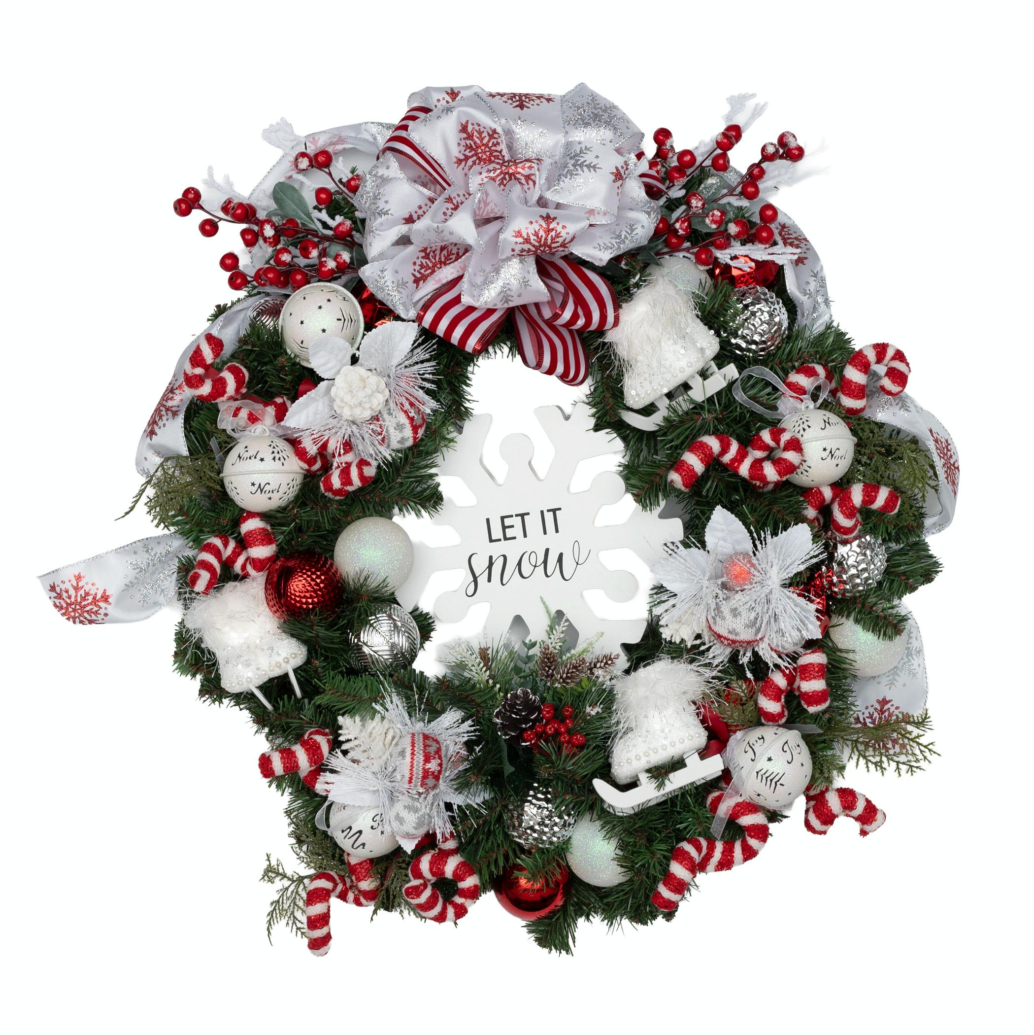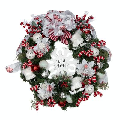 The Let is Snow wreath is adorned in traditional red and white with a large snowflake in the center. The wreath has many unique pieces to make it stand out like sparkle ice skates, white sparkle bells and red and white sweater textured ornaments. This wreath will be a wonderful addition to your Christmas decor this year and for years to come. Designed by Robin Eggers with HR Business Partners.