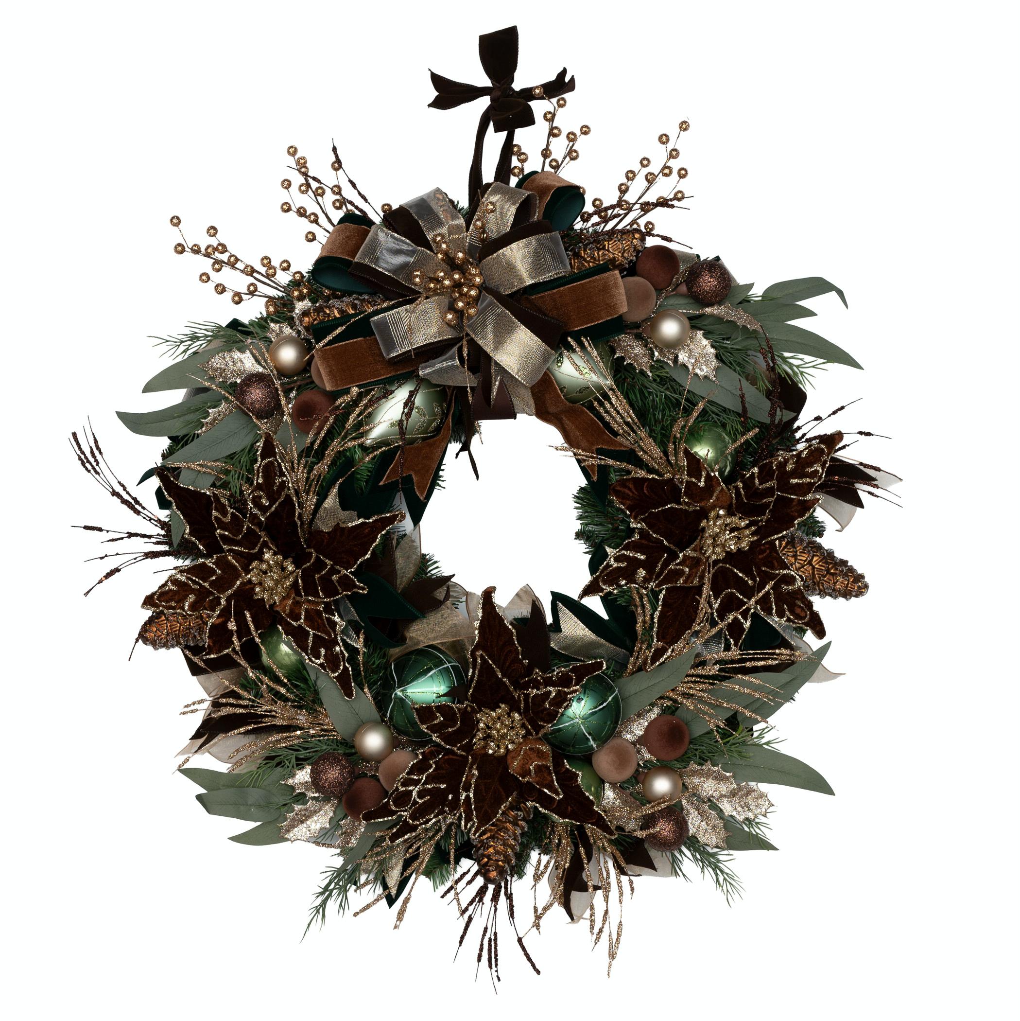 A luxurious wreath of emerald, gold, and brown adorned with velvet ribbons, and glass ornaments capturing the elegance of Christmas. Designed by Monette Derecho and Enedra Allen-McBride with Center for Reconstructive Surgery.