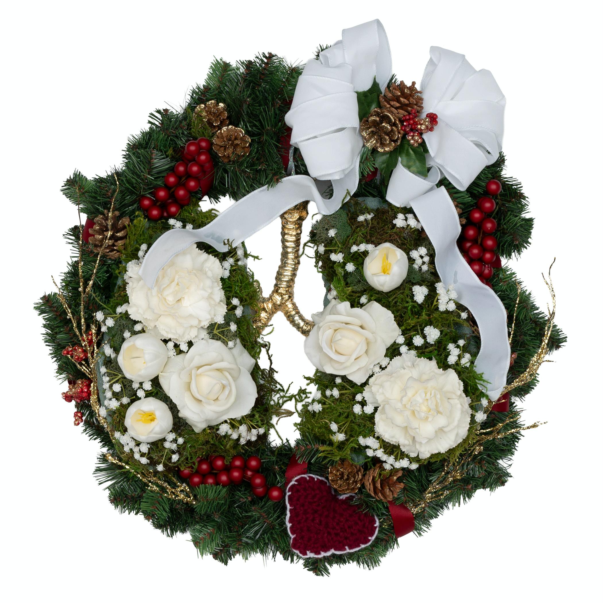 Created by the Thoracic/Head and Neck Medical Oncology Department, this wreath embodies the essence of life and connection. The very heart of our work in clinical trials. Shaped as two lungs joined by the trachea and heart, it symbolizes the breath that sustains us and the unity that drives discovery. The flowers woven throughout represent life, resilience, and hope. Each bloom a tribute to the patients, teams, and partnerships that make every study possible. Together, we breathe purpose into science and compassion into care, reminding us that in every trial, we truly BeLUNG together. Designed by the Thoracic Head & Neck Medical Oncology Staff. Includes a $100 Visa gift card, a $25 Starbucks Card to keep you warm while enjoying your wreath, a bottle of fragrance ($100 value), and a Nerdbugs Lung Plush.