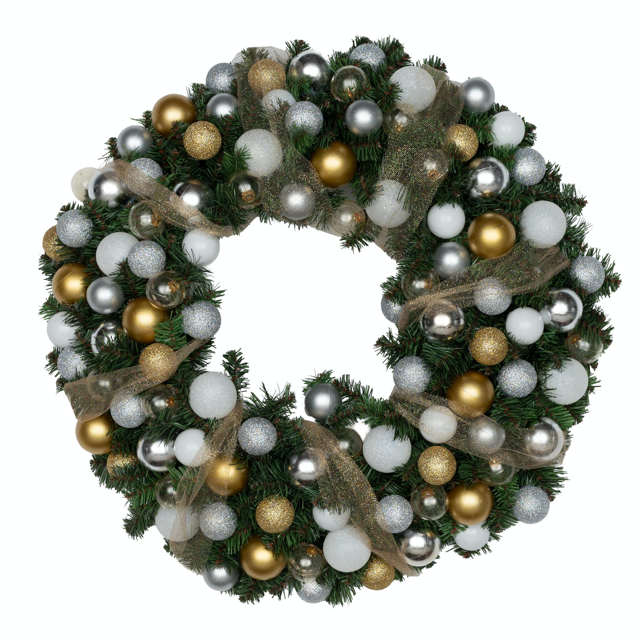 A classic Christmas wrath, decorated with gold and white balls and ribbon. Designed by Michelle Savage with Clinical Cancer Prevention.