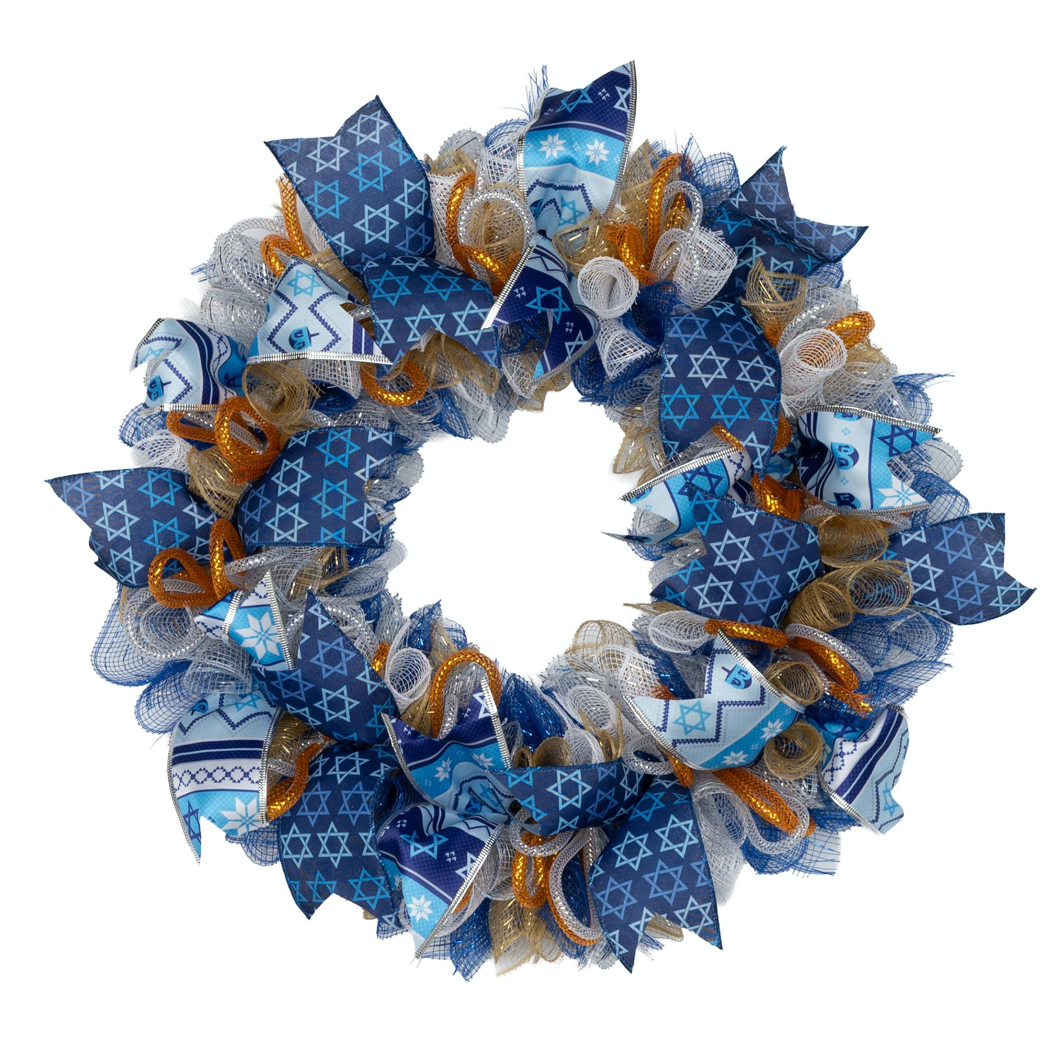 A blue, silver, & gold Hanukkah wreath. Designed by Madelyn Rosenthal & Connie Jacobs with Patient Affairs.