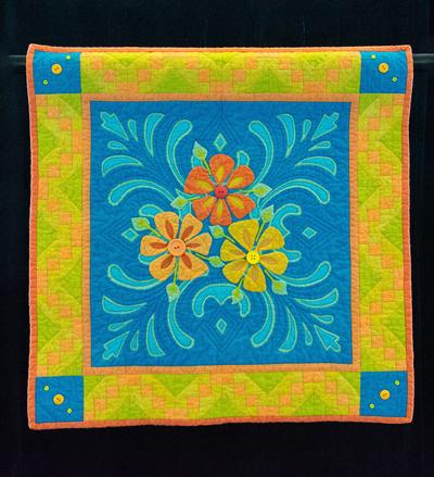 Bright and Cheery! Original pattern features reverse hand applique by "Eye of the Beholder Quilt Design". Created by Margaret Willingham.