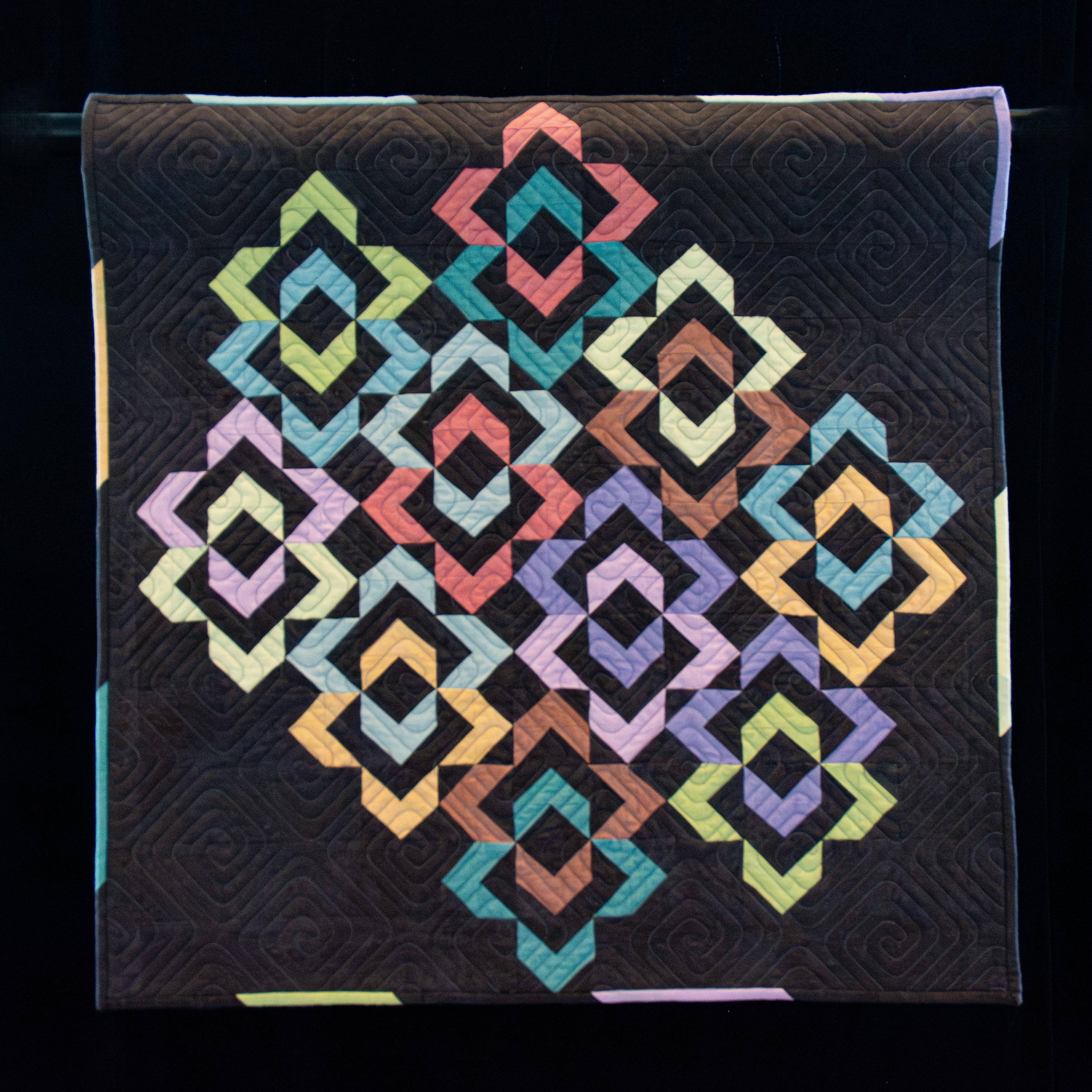 Made with 160 little flying geese units that interlock for a one of a kind wall hanging. Created by Debbie Layton