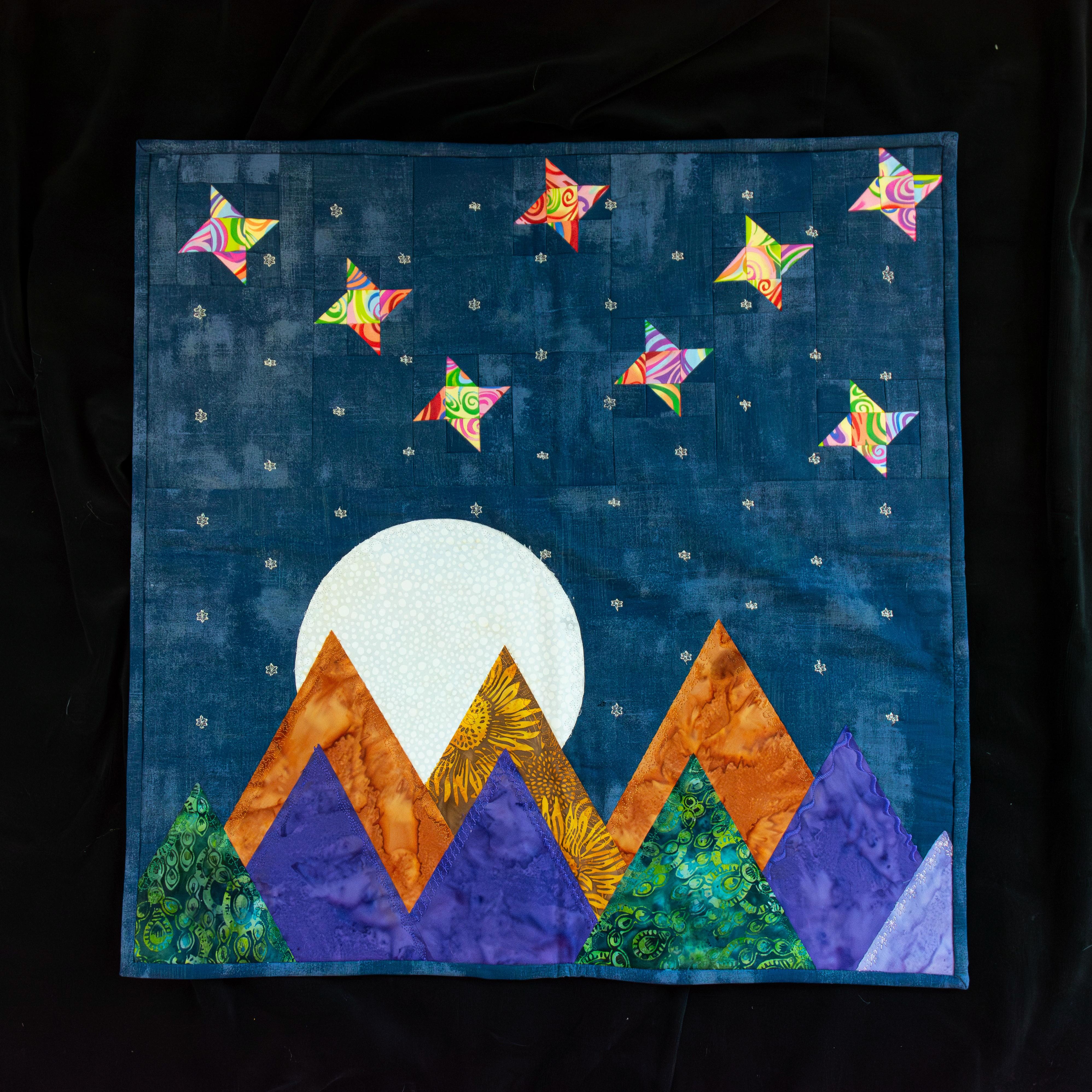 Sweet little wall hanging of a night sky with the moon and the mountains. Created by Linda Stanchos.