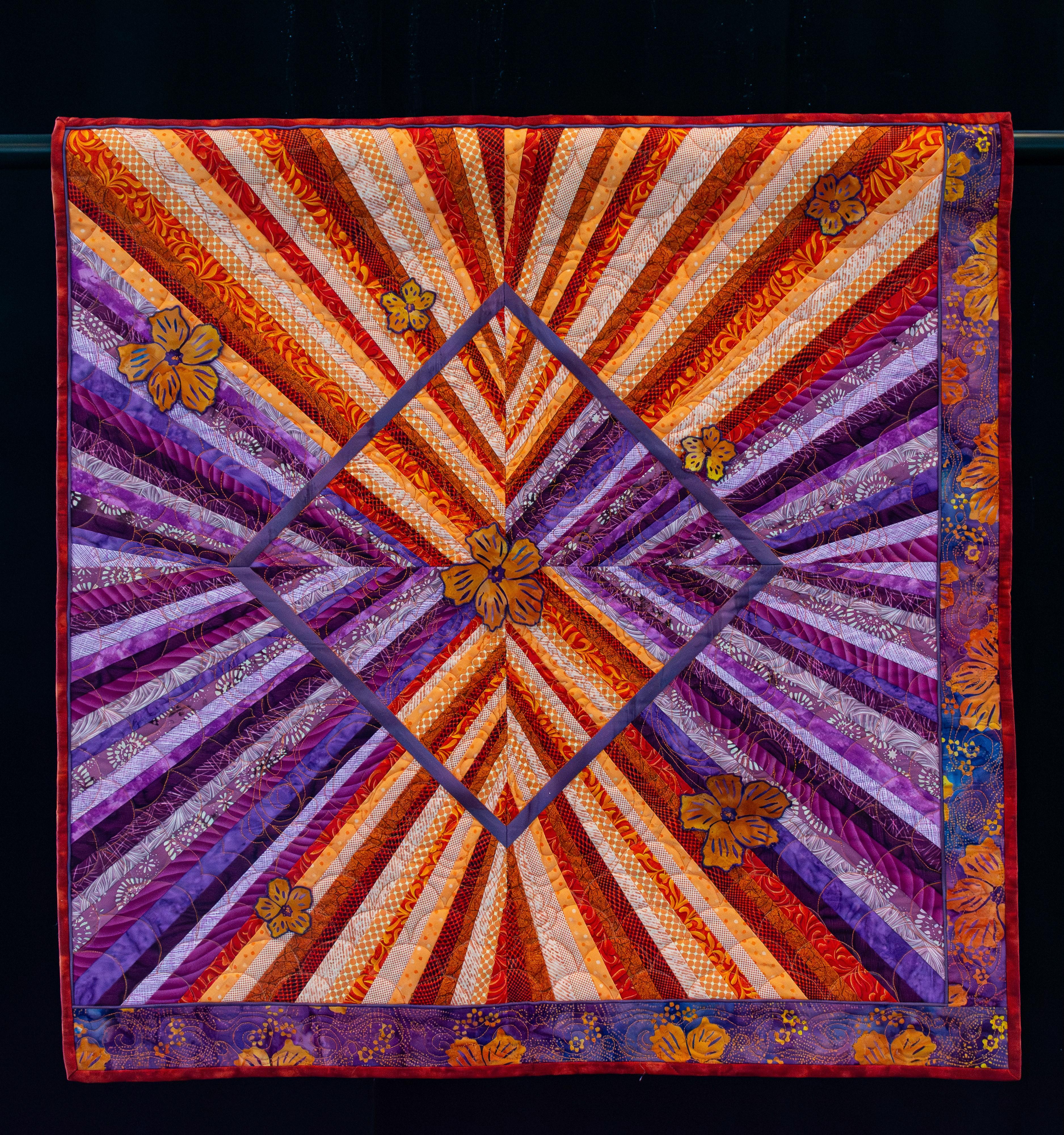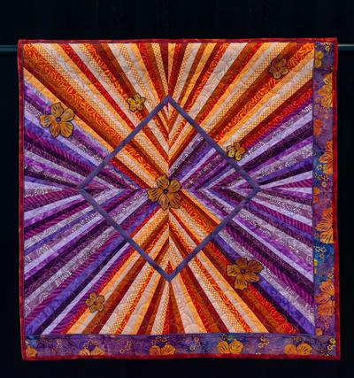 A wall hanging using warm and cool color fabric strips. The flower embellishments are delightfully 3D. Created by Marilyn Eparvier