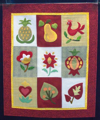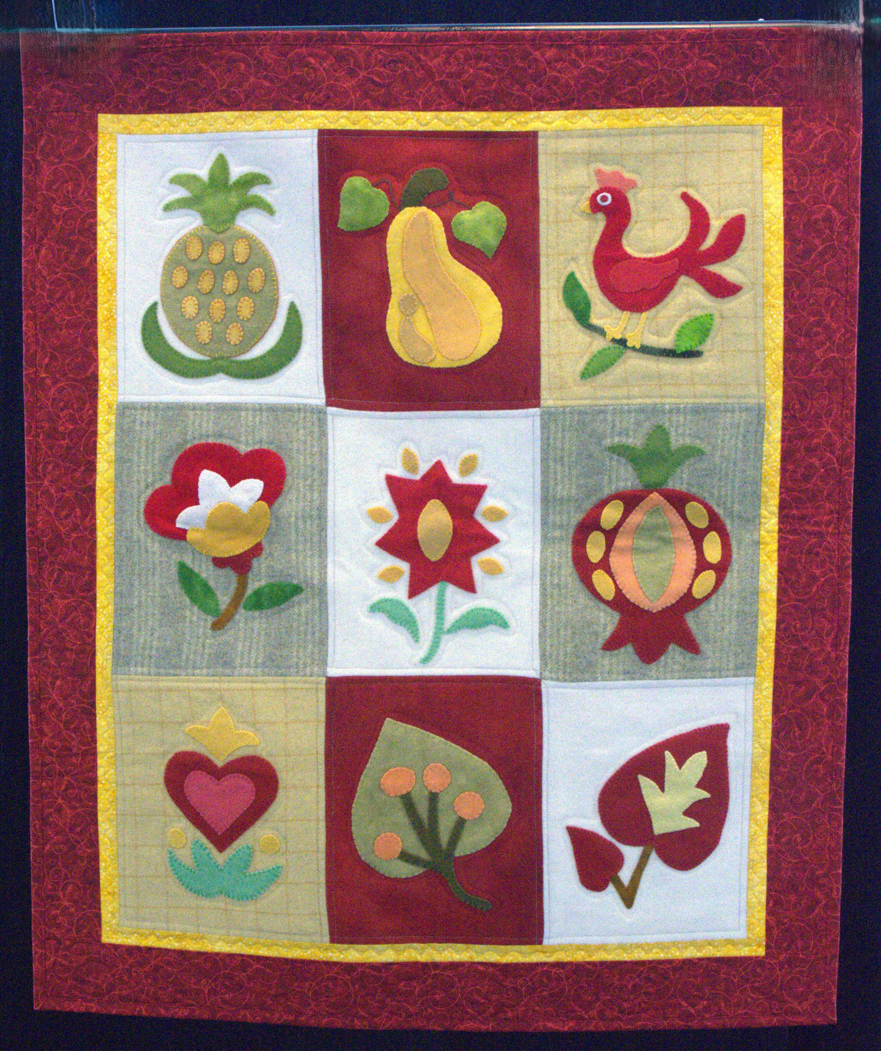 Stylized images of fruit, flowers and a chicken. Wool hand applique on wool background. Created by Marilyn Eparvier.