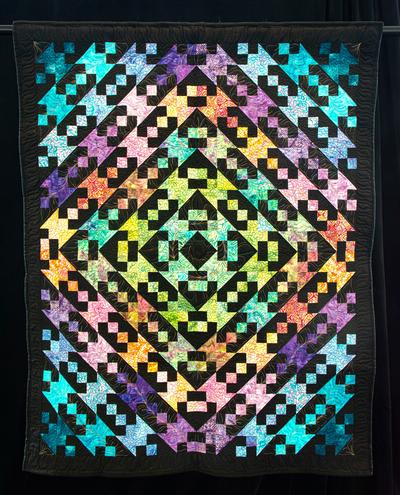 Color wave of cool to warm to cool while practicing precision piecing. Created by Madelyn Bell and quilted by Ginger Hayes.