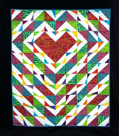 A heart center quit with a variety of color radiating outward. Created by Lorraine Wilkins