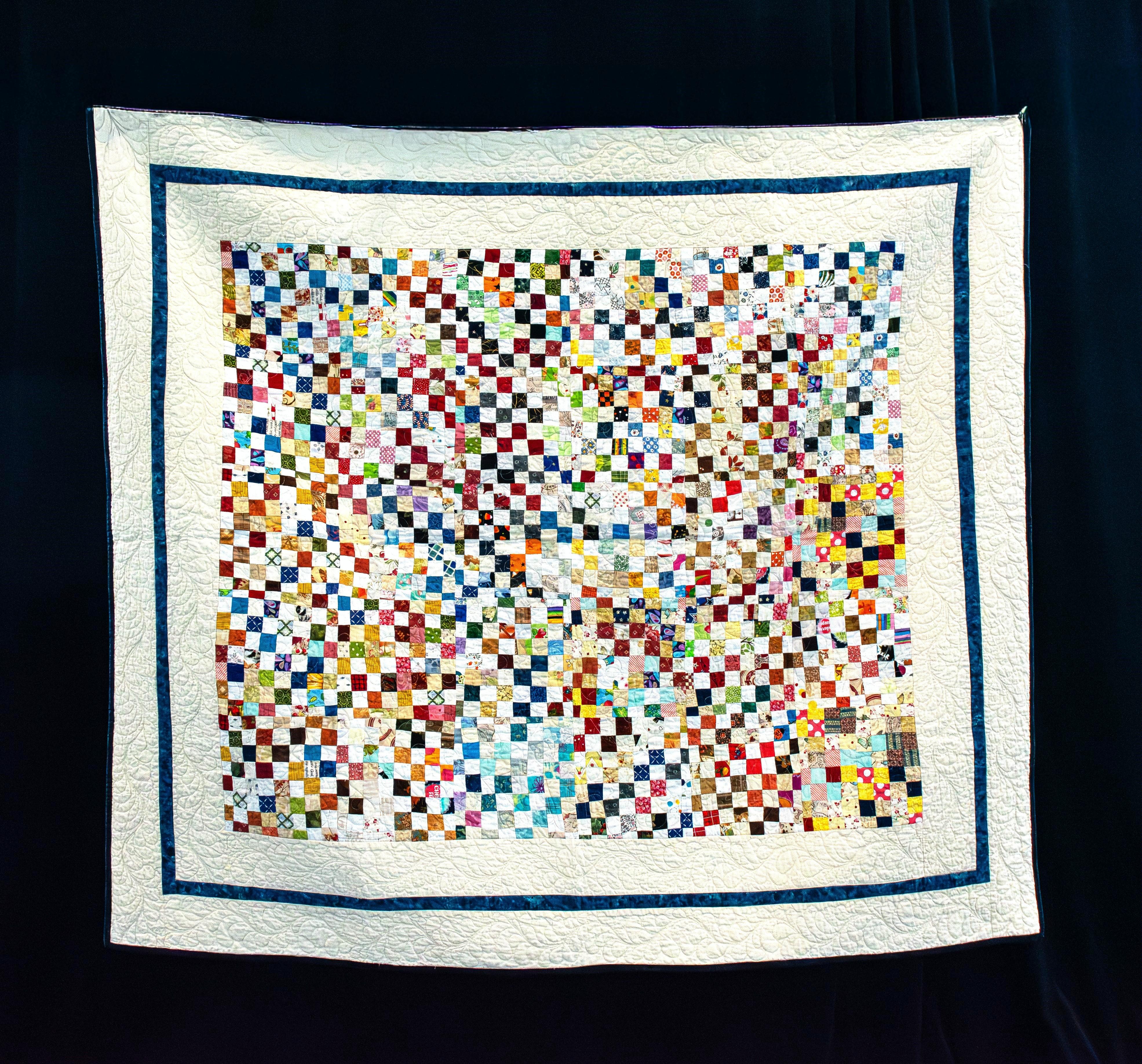 One-inch squares give the graphic impression of a favorite pastime of playing Bingo. The backing is "Bingo" fabric. Created by The Woodlands Area Quilt Guild.