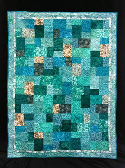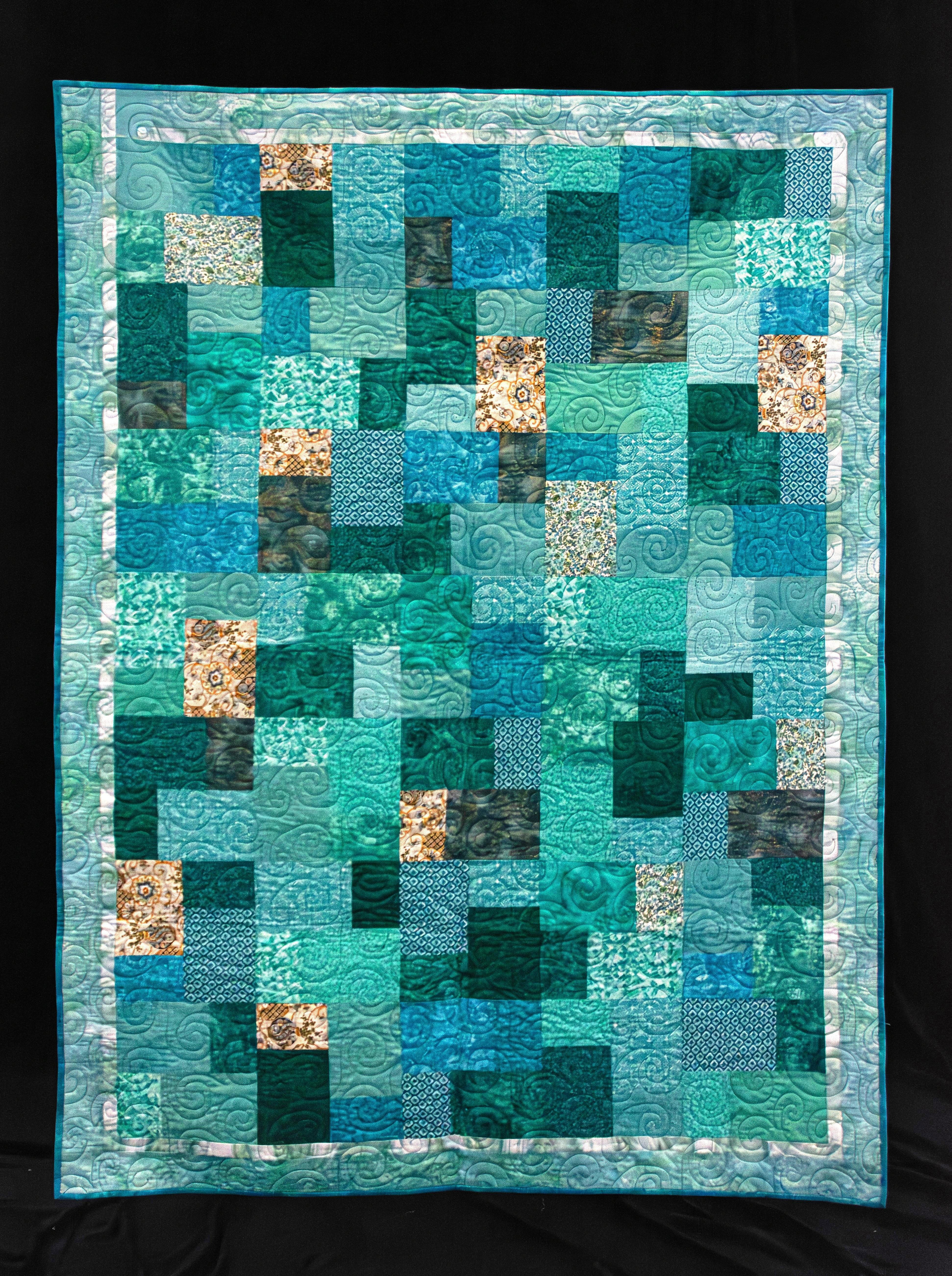 Healing colors of aquas, greens and whites for a soothing lap quilt. Made in memory of a family member. Created by Julie Bayhi.