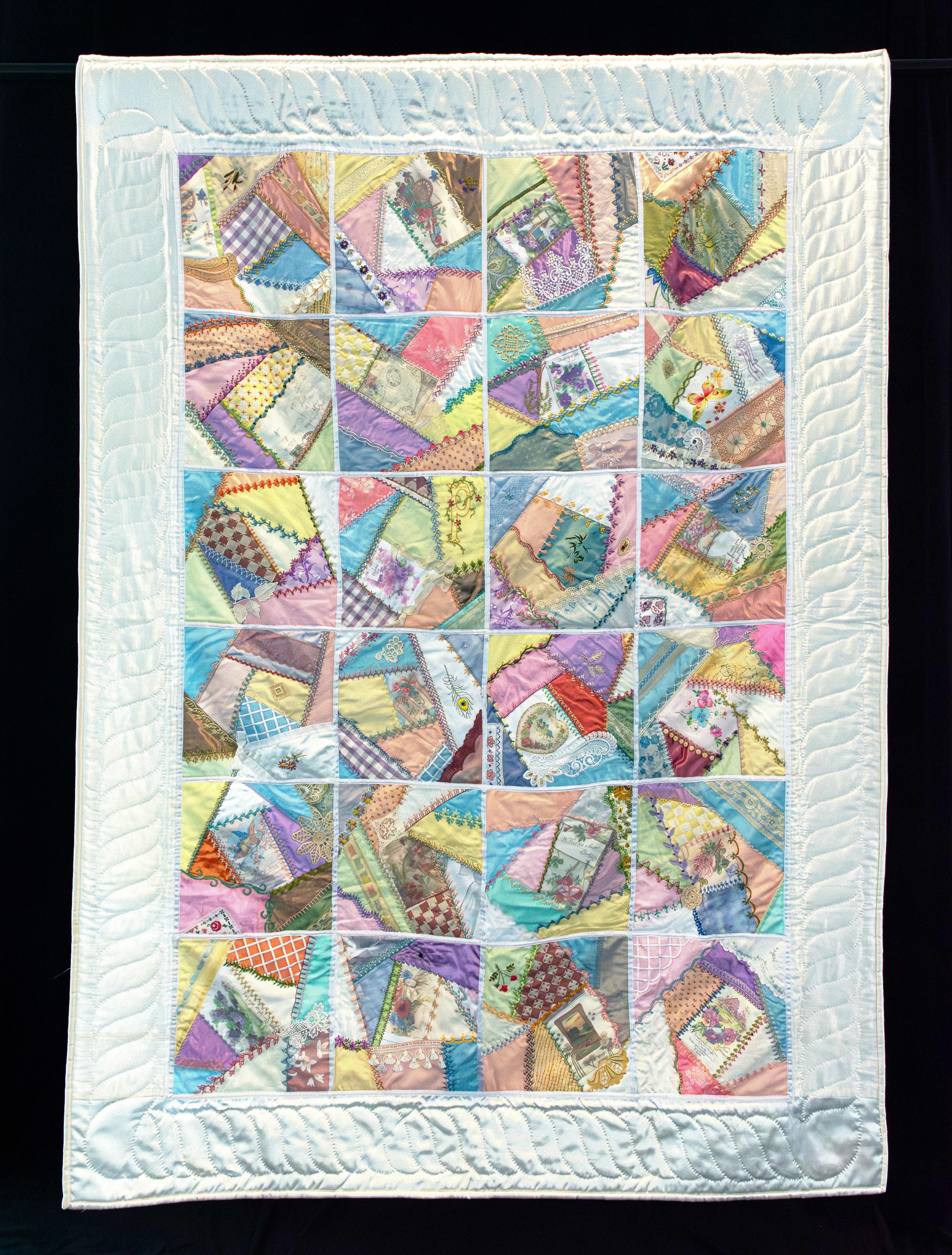 One of a kind! In the style of a vintage crazy quilt but this is recently made. Totally original and hand embroidered. Made by master quilter Phyllis Pokorny.