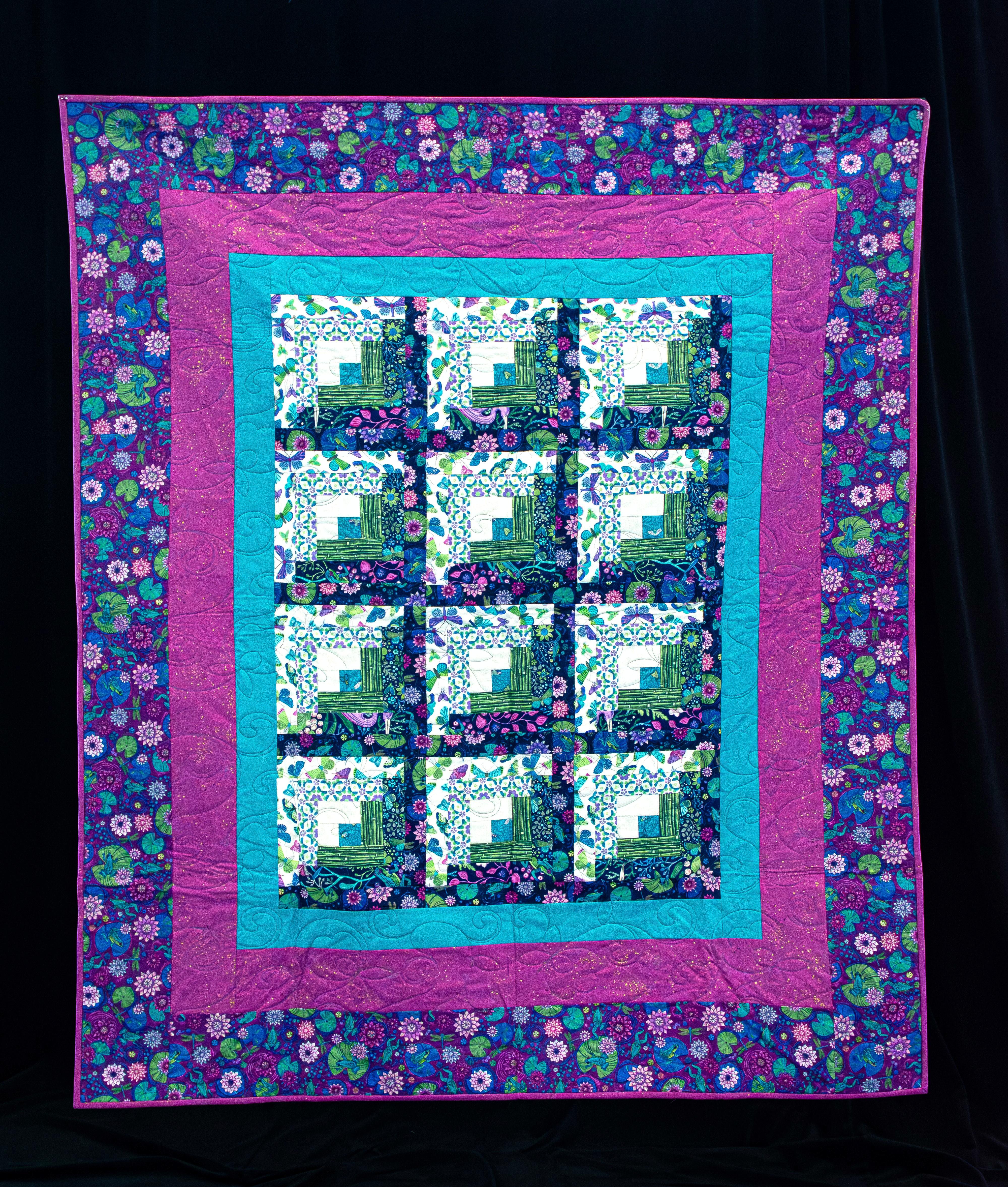 Log cabin quilt pattern in blue, teal and rose colors. Created by Nancy Baker.