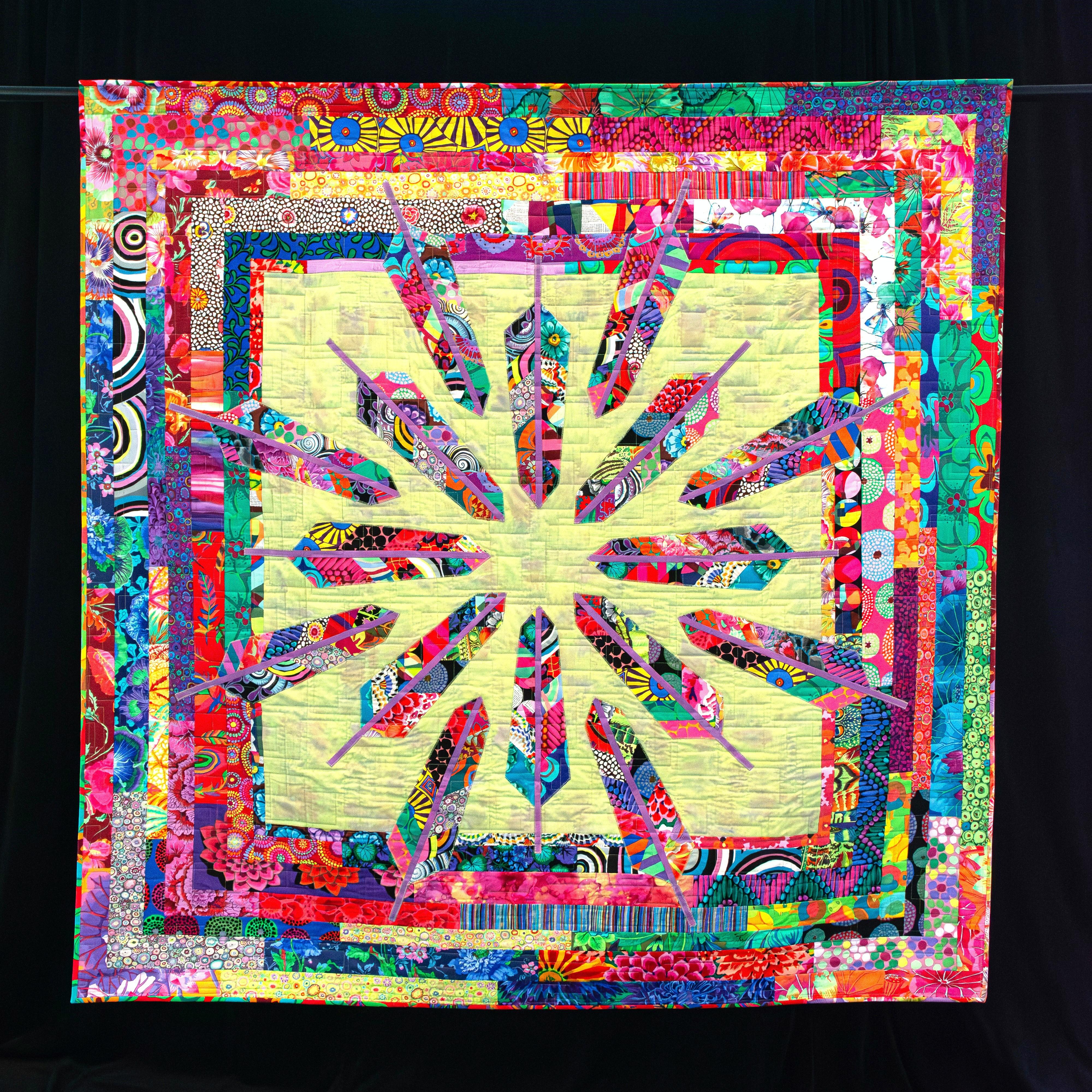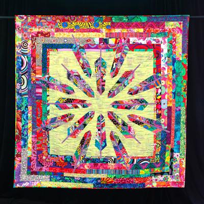 Focus II is an adaptation of Anna Maria Homer's feather design. The vibrant Kaffe fabrics adds to the artistry and uniqueness of this pattern. The feathers are appliqued to the background using a blanket stitch. Made by master quilter Rex Hubbard.