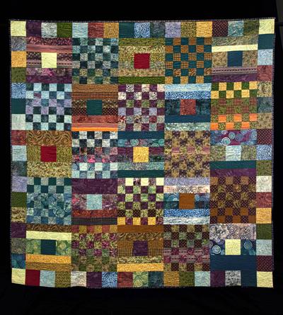 This quilt is based on a pattern by Kaffe Fassett and comprised of 11.5" blocks of squares and strips of batik and cotton fabrics bordered by 4" squares. Created by V B Moe.