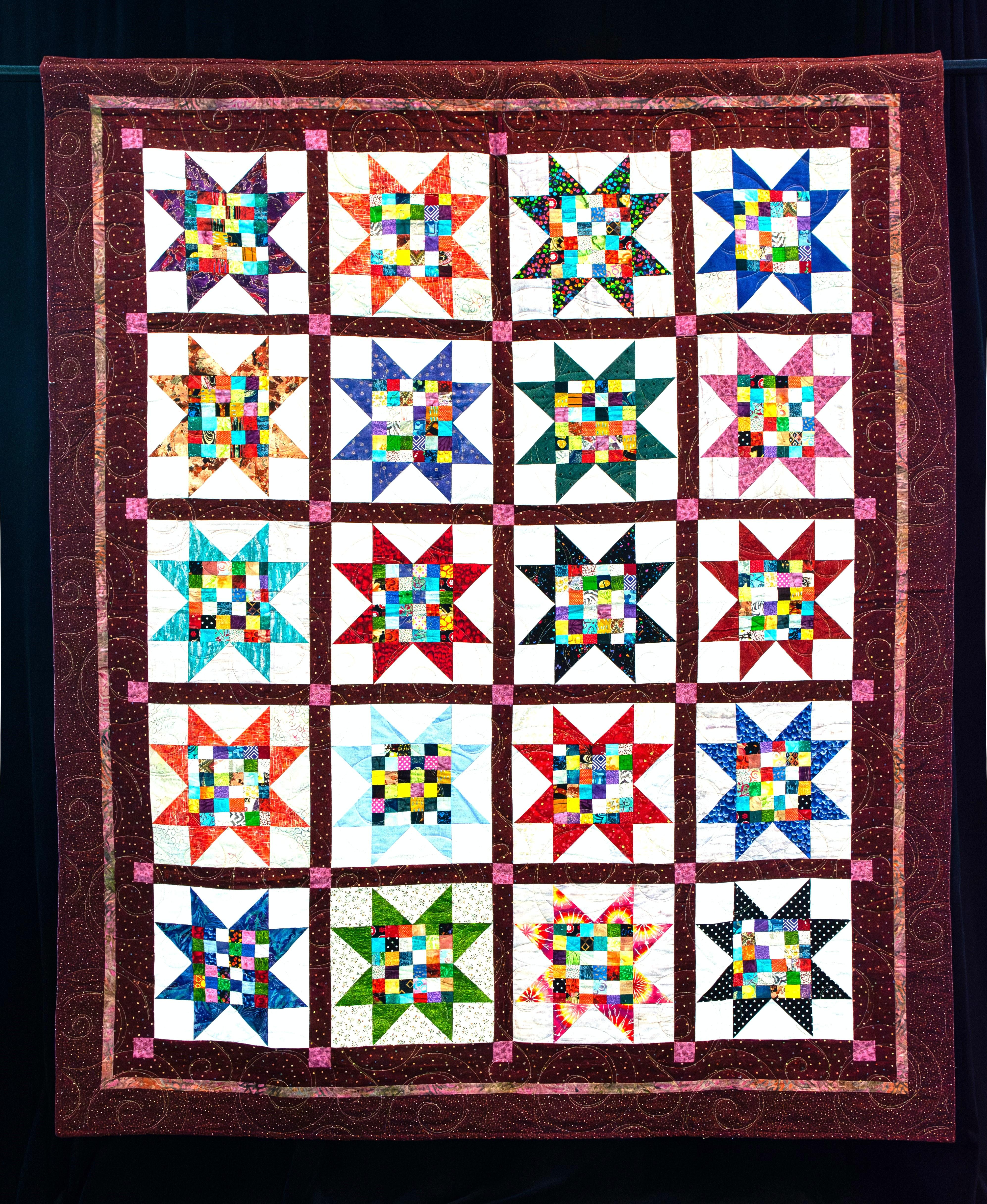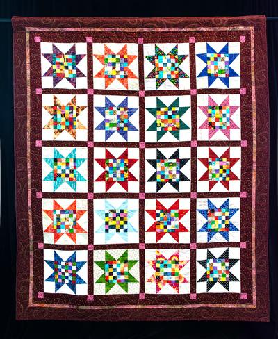 Twenty stars to brighten your life made in a wonderful original manner. So colorful and delightful. Created by Rhonda Onwere and quilted by Melissa Kaye.