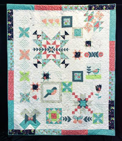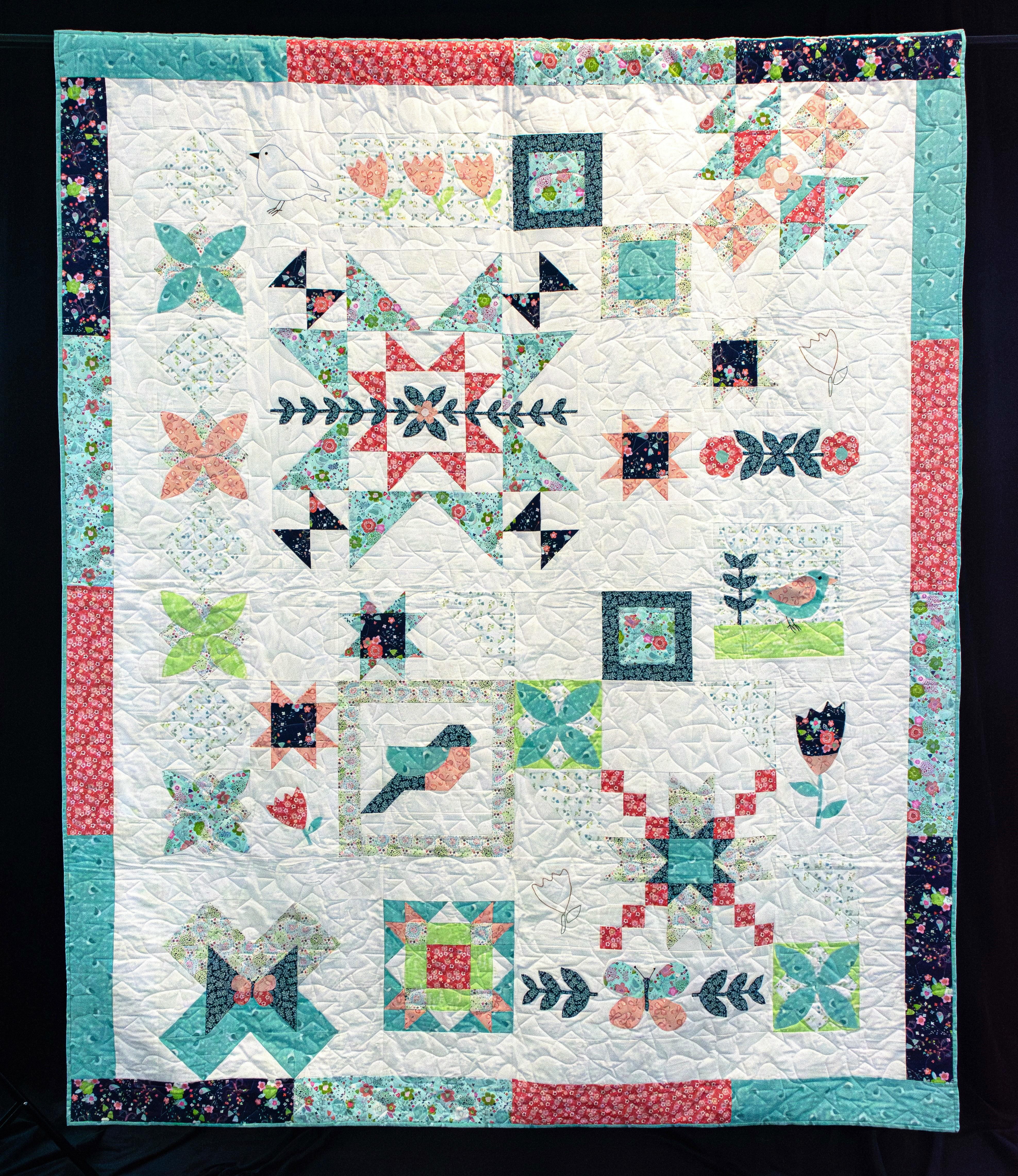 Friends completed this pastel flowers, birds and butterfly quilt from Cindy's stash. Binding and finishing by Mary Cotner, pieced by Madelyn Bell and quilted by Debbie Layton.
