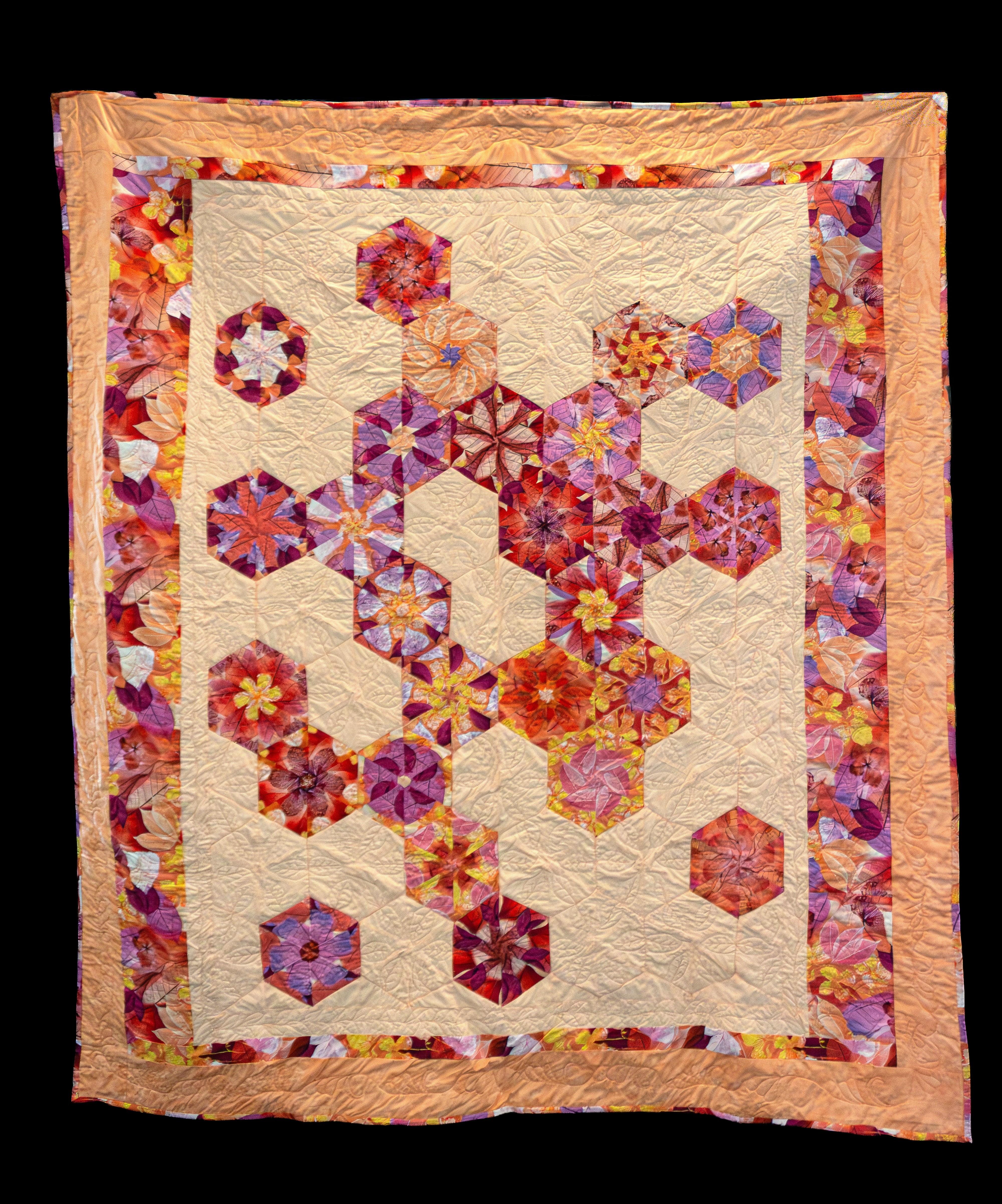 One block wonder! The colorful Kaleidescope blocks are sewn from six identical pieces. The printed sashing shows the original fabric. Free motion quilted. One of a kind. Created by Chris Young
